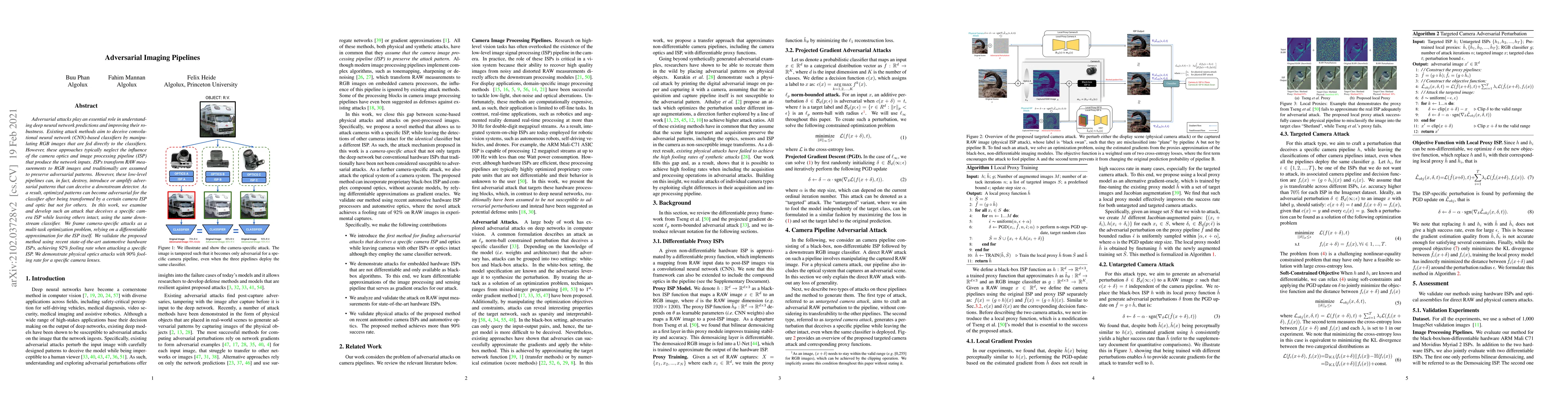 Adversarial attacks play an essential role in understanding deep neural network predictions and improving their robustness. Existing attack methods aim to deceive convolutional neural network (CNN)-based classifiers by manipulating RGB images that are fed directly to the classifiers. However, these approaches typically neglect the influence of the camera optics and image processing pipeline (ISP) that produce the network inputs. ISPs transform RAW measurements to RGB images and traditionally are assumed to preserve adversarial patterns. However, these low-level pipelines can, in fact, destroy, introduce or amplify adversarial patterns that can deceive a downstream detector. As a result, optimized patterns can become adversarial for the classifier after being transformed by a certain camera ISP and optic but not for others. In this work, we examine and develop such an attack that deceives a specific camera ISP while leaving others intact, using the same down-stream classifier. We frame camera-specific attacks as a multi-task optimization problem, relying on a differentiable approximation for the ISP itself. We validate the proposed method using recent state-of-the-art automotive hardware ISPs, achieving 92% fooling rate when attacking a specific ISP. We demonstrate physical optics attacks with 90% fooling rate for a specific camera lenses.