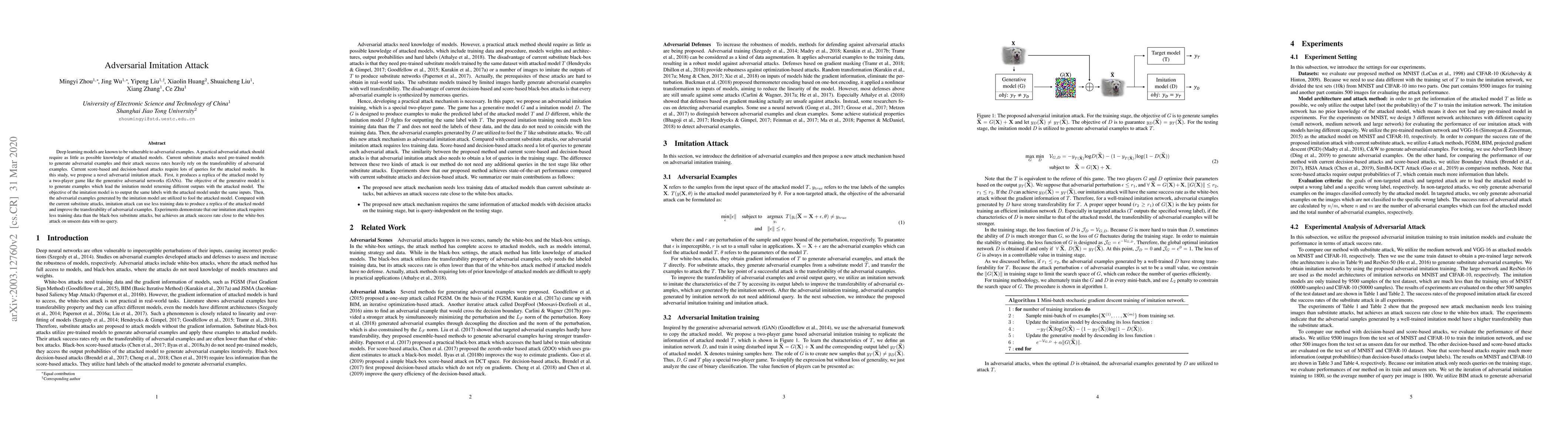 Deep learning models are known to be vulnerable to adversarial examples. A practical adversarial attack should require as little as possible knowledge of attacked models. Current substitute attacks need pre-trained models to generate adversarial examples and their attack success rates heavily rely on the transferability of adversarial examples. Current score-based and decision-based attacks require lots of queries for the attacked models. In this study, we propose a novel adversarial imitation attack. First, it produces a replica of the attacked model by a two-player game like the generative adversarial networks (GANs). The objective of the generative model is to generate examples that lead the imitation model returning different outputs with the attacked model. The objective of the imitation model is to output the same labels with the attacked model under the same inputs. Then, the adversarial examples generated by the imitation model are utilized to fool the attacked model. Compared with the current substitute attacks, imitation attacks can use less training data to produce a replica of the attacked model and improve the transferability of adversarial examples. Experiments demonstrate that our imitation attack requires less training data than the black-box substitute attacks, but achieves an attack success rate close to the white-box attack on unseen data with no query.