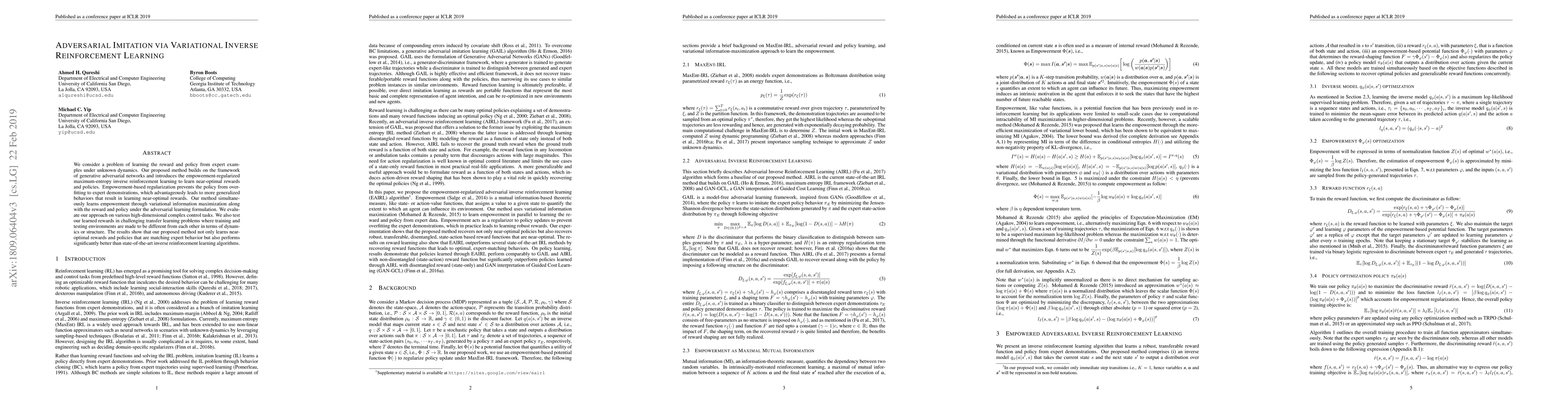 This paper proposes a method for learning optimal rewards and policies from expert demonstrations using adversarial imitation and variational inverse reinforcement learning, with empowerment-based regularization to prevent overfitting. The method shows superior performance in complex control tasks and transfer learning scenarios compared to existing algorithms.