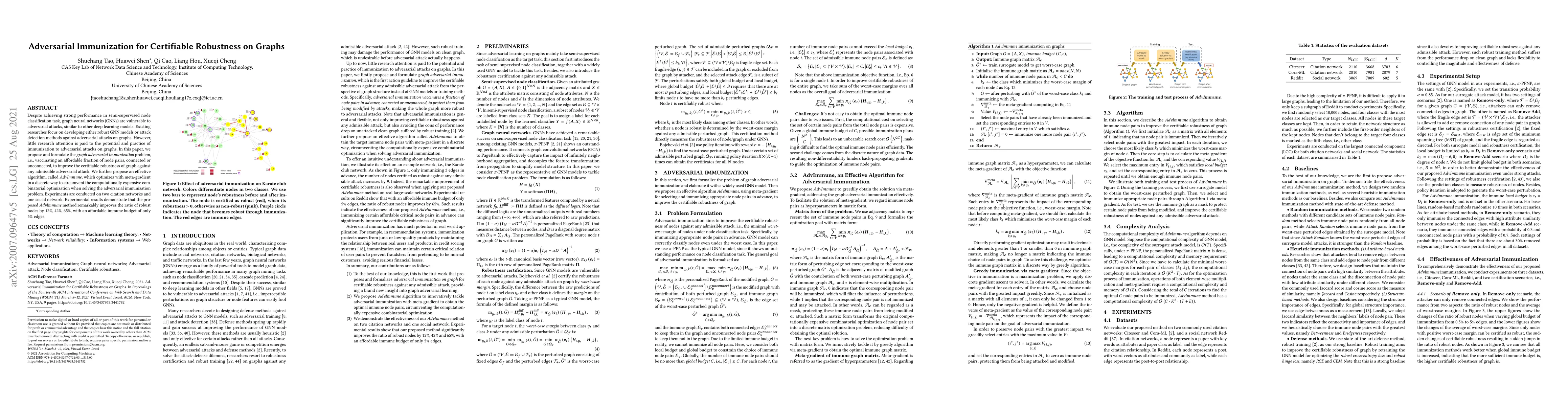Despite achieving strong performance in semi-supervised node classification task, graph neural networks (GNNs) are vulnerable to adversarial attacks, similar to other deep learning models. Existing researches focus on developing either robust GNN models or attack detection methods against adversarial attacks on graphs. However, little research attention is paid to the potential and practice of immunization to adversarial attacks on graphs. In this paper, we propose and formulate the graph adversarial immunization problem, i.e., vaccinating an affordable fraction of node pairs, connected or unconnected, to improve the certifiable robustness of graph against any admissible adversarial attack. We further propose an effective algorithm, called AdvImmune, which optimizes with meta-gradient in a discrete way to circumvent the computationally expensive combinatorial optimization when solving the adversarial immunization problem. Experiments are conducted on two citation networks and one social network. Experimental results demonstrate that the proposed AdvImmune method remarkably improves the ratio of robust nodes by 12%, 42%, 65%, with an affordable immune budget of only 5% edges.