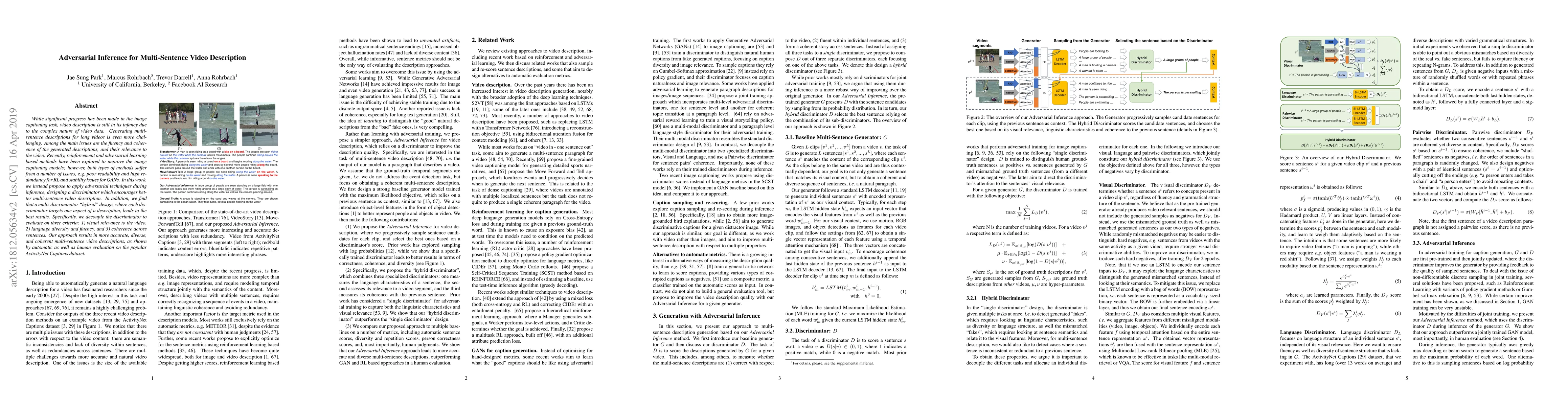 While significant progress has been made in the image captioning task, video description is still in its infancy due to the complex nature of video data. Generating multi-sentence descriptions for long videos is even more challenging. Among the main issues are the fluency and coherence of the generated descriptions, and their relevance to the video. Recently, reinforcement and adversarial learning based methods have been explored to improve the image captioning models; however, both types of methods suffer from a number of issues, e.g. poor readability and high redundancy for RL and stability issues for GANs. In this work, we instead propose to apply adversarial techniques during inference, designing a discriminator which encourages better multi-sentence video description. In addition, we find that a multi-discriminator "hybrid" design, where each discriminator targets one aspect of a description, leads to the best results. Specifically, we decouple the discriminator to evaluate on three criteria: 1) visual relevance to the video, 2) language diversity and fluency, and 3) coherence across sentences. Our approach results in more accurate, diverse, and coherent multi-sentence video descriptions, as shown by automatic as well as human evaluation on the popular ActivityNet Captions dataset.