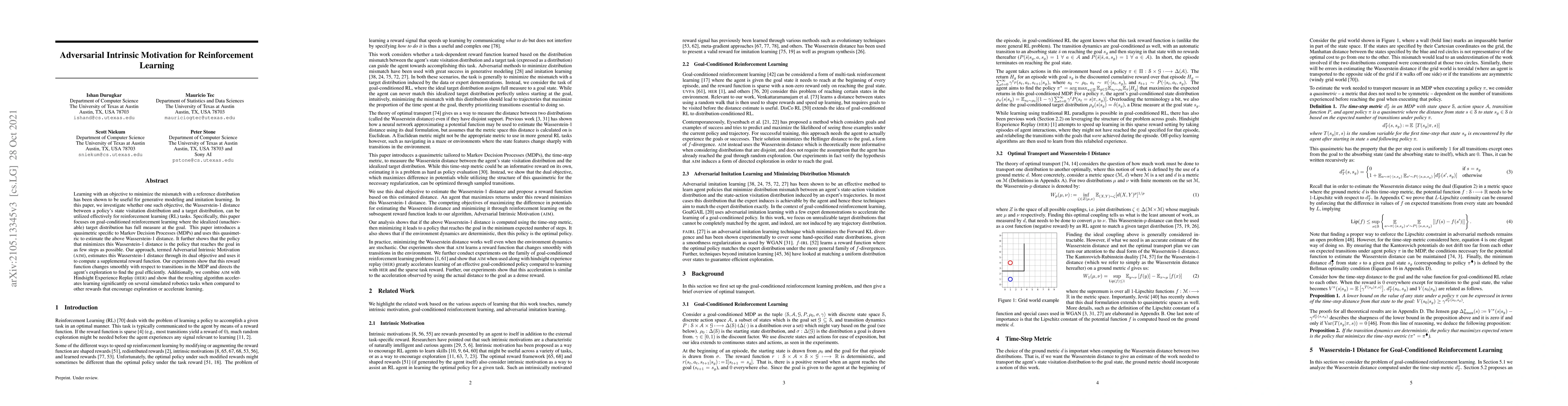 This paper proposes Adversarial Intrinsic Motivation (AIM), utilizing the Wasserstein-1 distance to guide reinforcement learning, particularly in goal-conditioned tasks. AIM effectively computes a reward function that encourages the agent to reach goals efficiently and enhances learning when combined with Hindsight Experience Replay.