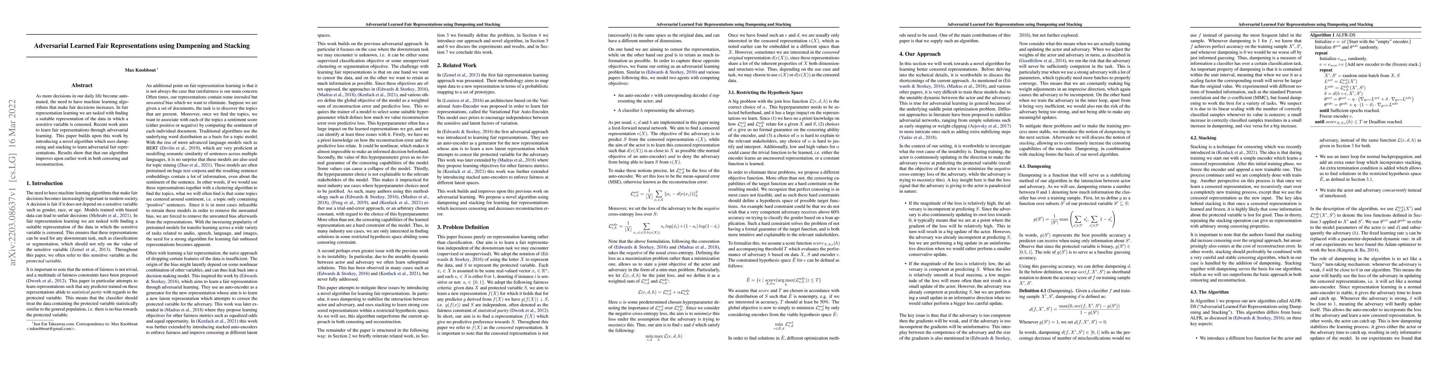 This paper proposes a novel algorithm using dampening and stacking for adversarial learned fair representations, improving upon previous methods in both censoring sensitive variables and data reconstruction. The approach aims to develop fair machine learning algorithms for automated decision-making.