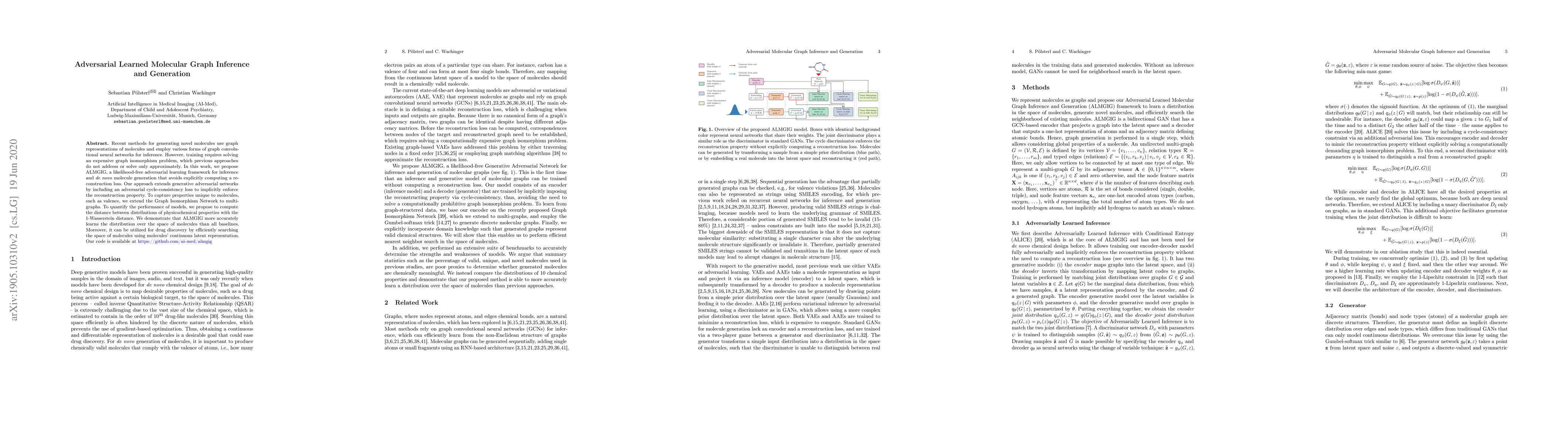 Recent methods for generating novel molecules use graph representations of molecules and employ various forms of graph convolutional neural networks for inference. However, training requires solving an expensive graph isomorphism problem, which previous approaches do not address or solve only approximately. In this work, we propose ALMGIG, a likelihood-free adversarial learning framework for inference and de novo molecule generation that avoids explicitly computing a reconstruction loss. Our approach extends generative adversarial networks by including an adversarial cycle-consistency loss to implicitly enforce the reconstruction property. To capture properties unique to molecules, such as valence, we extend the Graph Isomorphism Network to multi-graphs. To quantify the performance of models, we propose to compute the distance between distributions of physicochemical properties with the 1-Wasserstein distance. We demonstrate that ALMGIG more accurately learns the distribution over the space of molecules than all baselines. Moreover, it can be utilized for drug discovery by efficiently searching the space of molecules using molecules' continuous latent representation. Our code is available at https://github.com/ai-med/almgig
