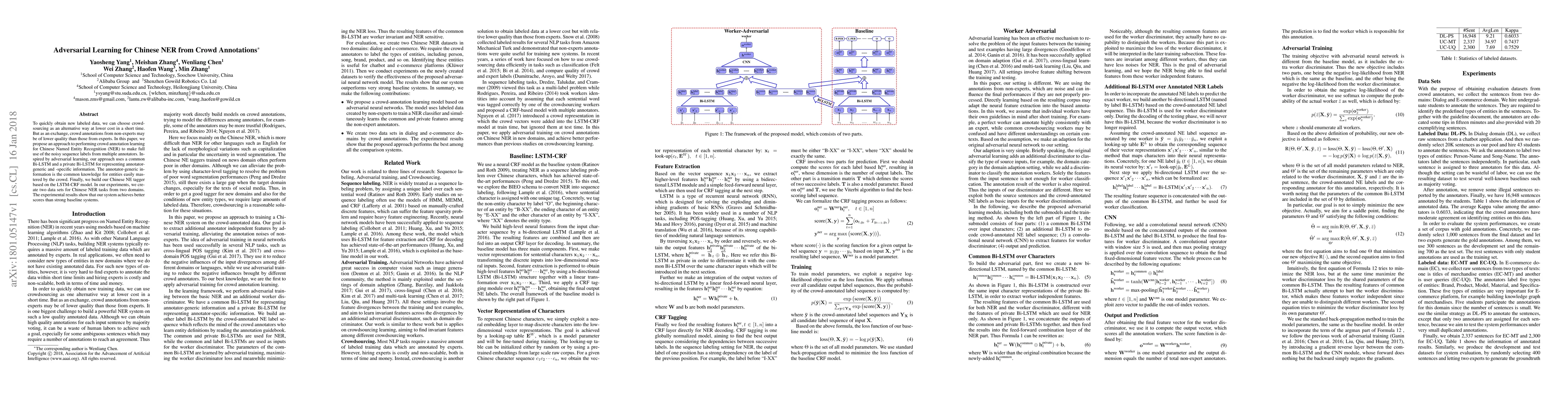 This paper proposes an adversarial learning approach for Chinese Named Entity Recognition (NER) using crowd-sourced annotations, employing a common and a private Bi-LSTM to extract generic and specific annotator information. The LSTM-CRF model-based tagger outperforms strong baseline systems in experiments on two Chinese NER datasets.