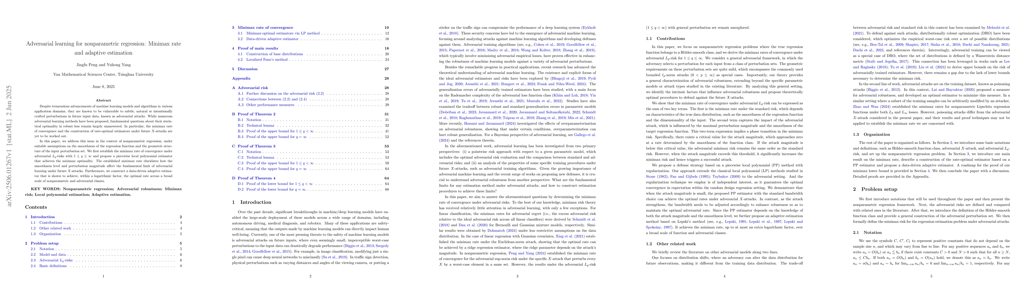 The paper presents the minimax rate of convergence for adversarial learning in nonparametric regression and constructs adaptive estimators that achieve near-optimal performance under future $X$-attacks.