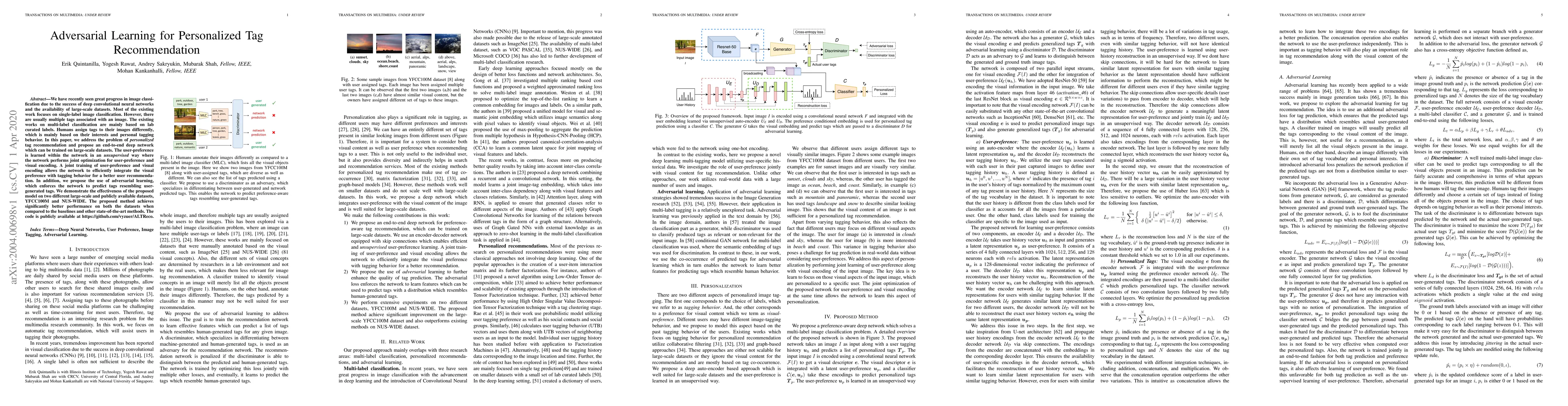 This paper proposes an end-to-end deep network for personalized tag recommendation that integrates user-preference and visual encoding through adversarial learning, achieving better performance on large-scale datasets YFCC100M and NUS-WIDE compared to baselines. The model learns user-preferences in an unsupervised manner and demonstrates significant improvements in tag recommendation accuracy.