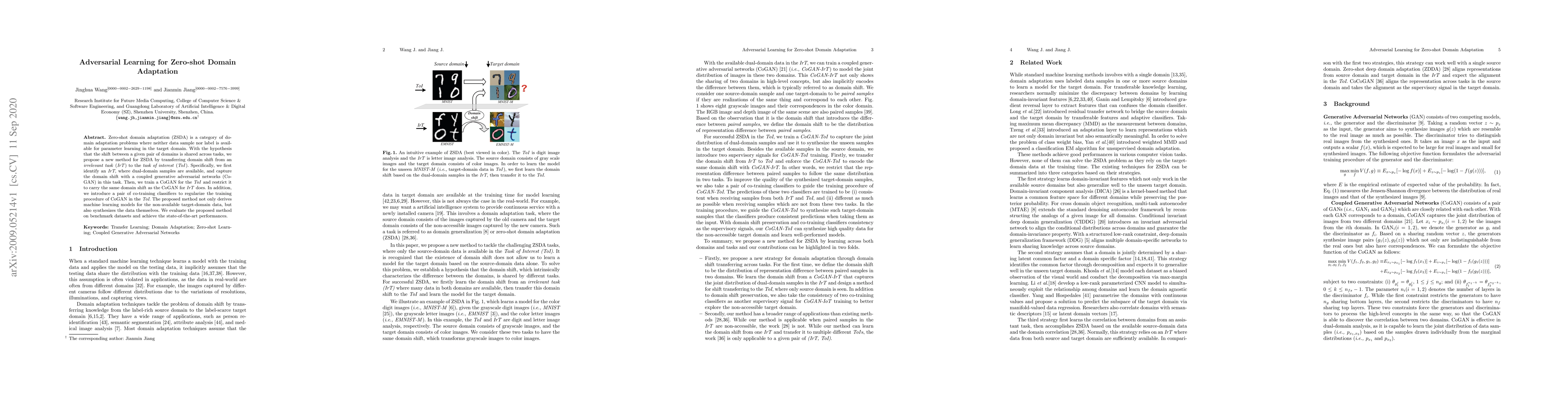 This paper proposes a novel adversarial learning method for zero-shot domain adaptation by transferring domain shift from an irrelevant task to a task of interest using coupled generative adversarial networks (CoGAN). The method synthesizes target-domain data and achieves state-of-the-art performance on benchmark datasets.