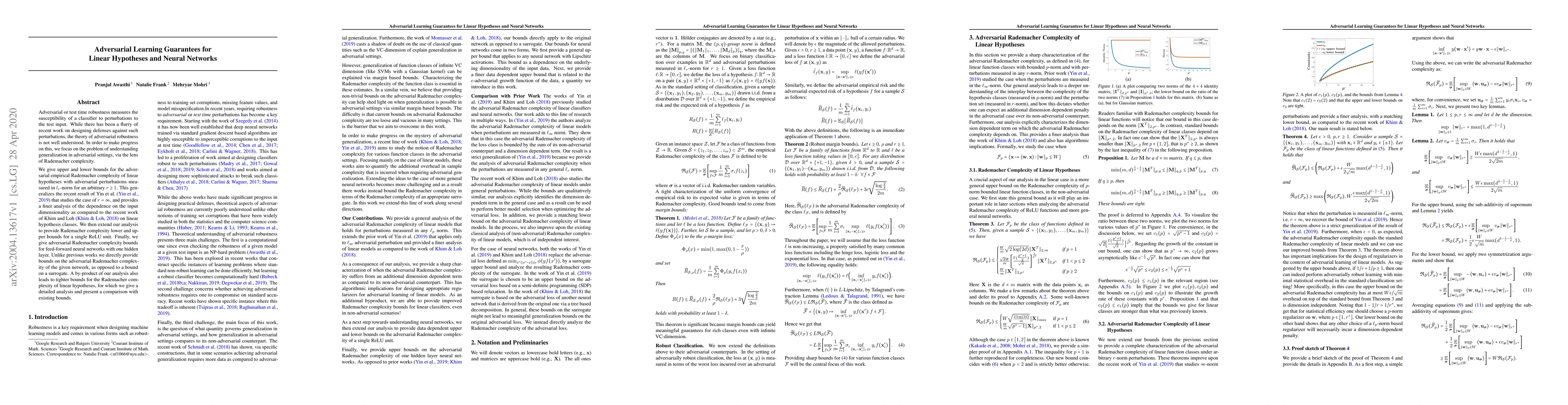 The paper presents detailed bounds on adversarial Rademacher complexity for linear hypotheses and neural networks, offering a finer analysis compared to previous work.