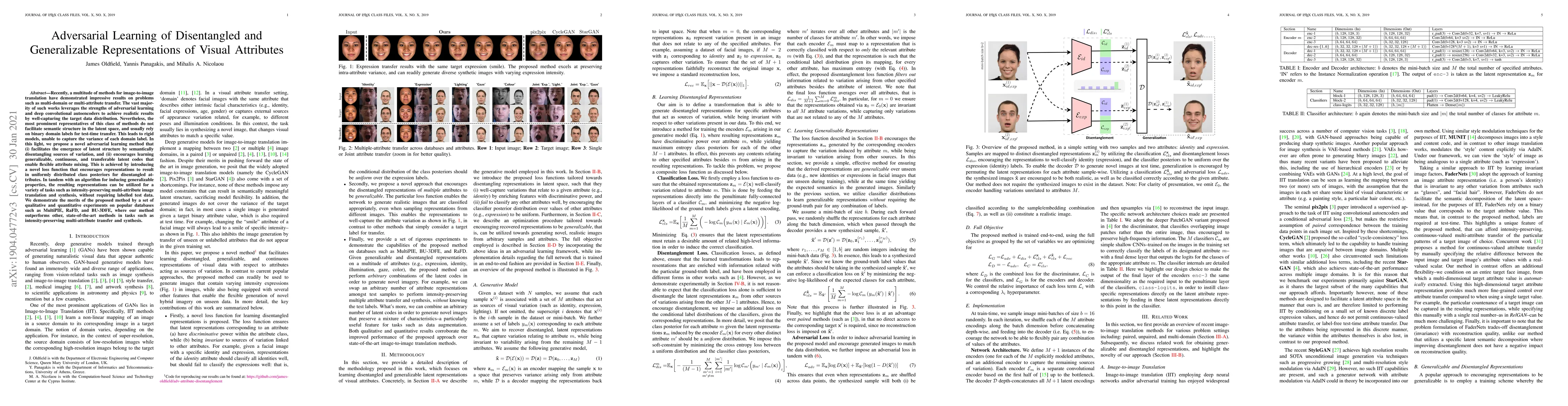 Recently, a multitude of methods for image-to-image translation have demonstrated impressive results on problems such as multi-domain or multi-attribute transfer. The vast majority of such works leverages the strengths of adversarial learning and deep convolutional autoencoders to achieve realistic results by well-capturing the target data distribution. Nevertheless, the most prominent representatives of this class of methods do not facilitate semantic structure in the latent space, and usually rely on binary domain labels for test-time transfer. This leads to rigid models, unable to capture the variance of each domain label. In this light, we propose a novel adversarial learning method that (i) facilitates the emergence of latent structure by semantically disentangling sources of variation, and (ii) encourages learning generalizable, continuous, and transferable latent codes that enable flexible attribute mixing. This is achieved by introducing a novel loss function that encourages representations to result in uniformly distributed class posteriors for disentangled attributes. In tandem with an algorithm for inducing generalizable properties, the resulting representations can be utilized for a variety of tasks such as intensity-preserving multi-attribute image translation and synthesis, without requiring labelled test data. We demonstrate the merits of the proposed method by a set of qualitative and quantitative experiments on popular databases such as MultiPIE, RaFD, and BU-3DFE, where our method outperforms other, state-of-the-art methods in tasks such as intensity-preserving multi-attribute transfer and synthesis.