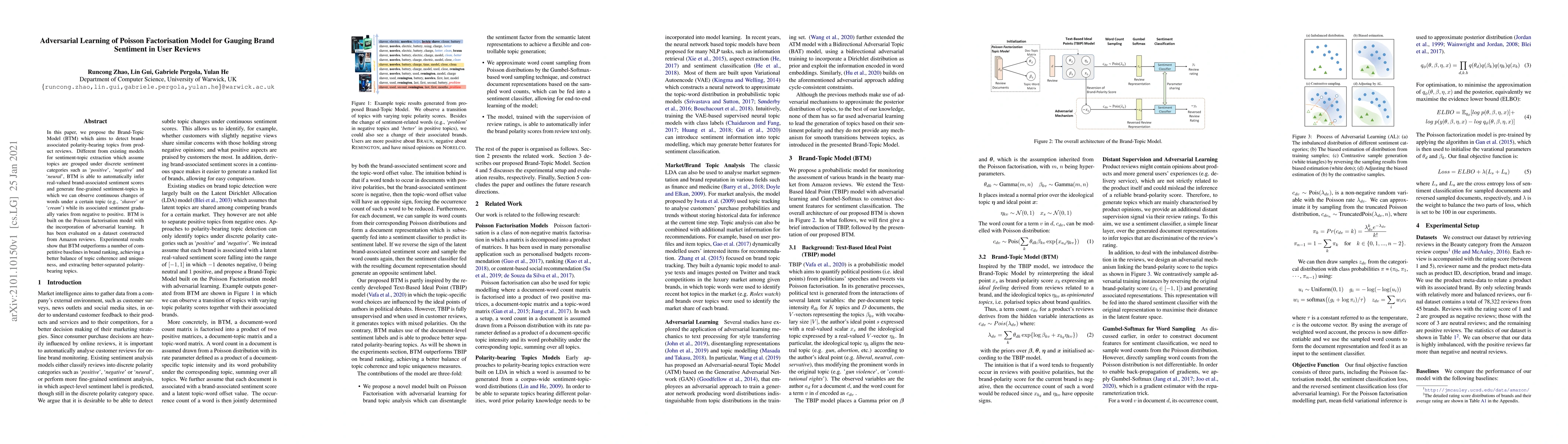 This paper introduces the Brand-Topic Model (BTM) to detect brand-associated sentiment in product reviews using Poisson factorisation and adversarial learning, achieving continuous sentiment inference and fine-grained sentiment-topics. BTM outperforms baselines in brand ranking and sentiment topic extraction.