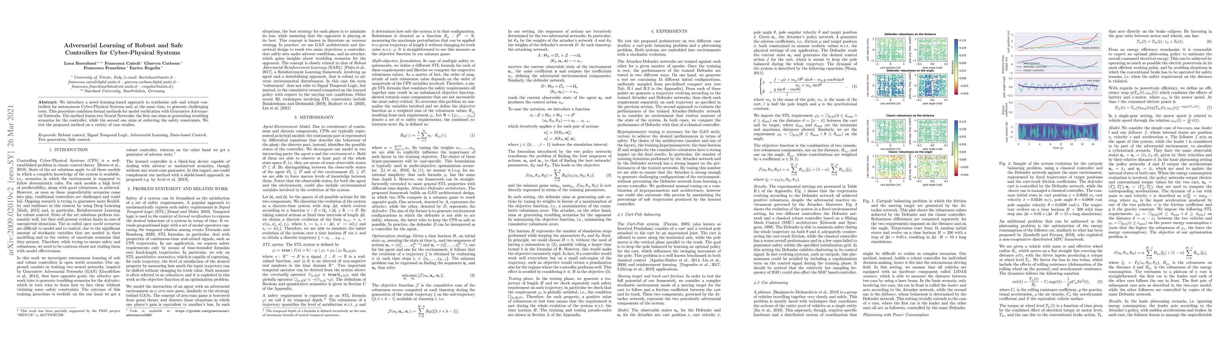 The paper proposes a novel method to synthesize safe and robust controllers for autonomous Cyber-Physical Systems using Generative Adversarial Networks, combining formal verification with adversarial learning to generate challenging tests and enforce safety constraints. The effectiveness is demonstrated through various case studies.