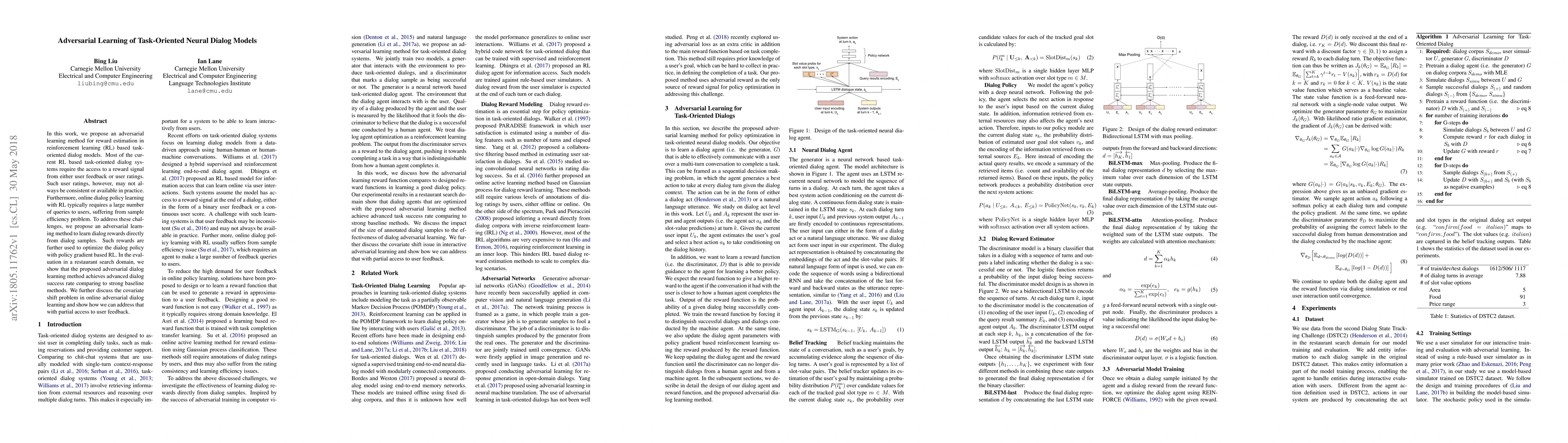 This paper proposes an adversarial learning method for estimating rewards in reinforcement learning-based task-oriented dialog models without relying on user feedback. The method learns dialog rewards directly from samples and optimizes the dialog policy using policy gradient reinforcement learning, achieving better success rates than baseline methods in a restaurant search domain.