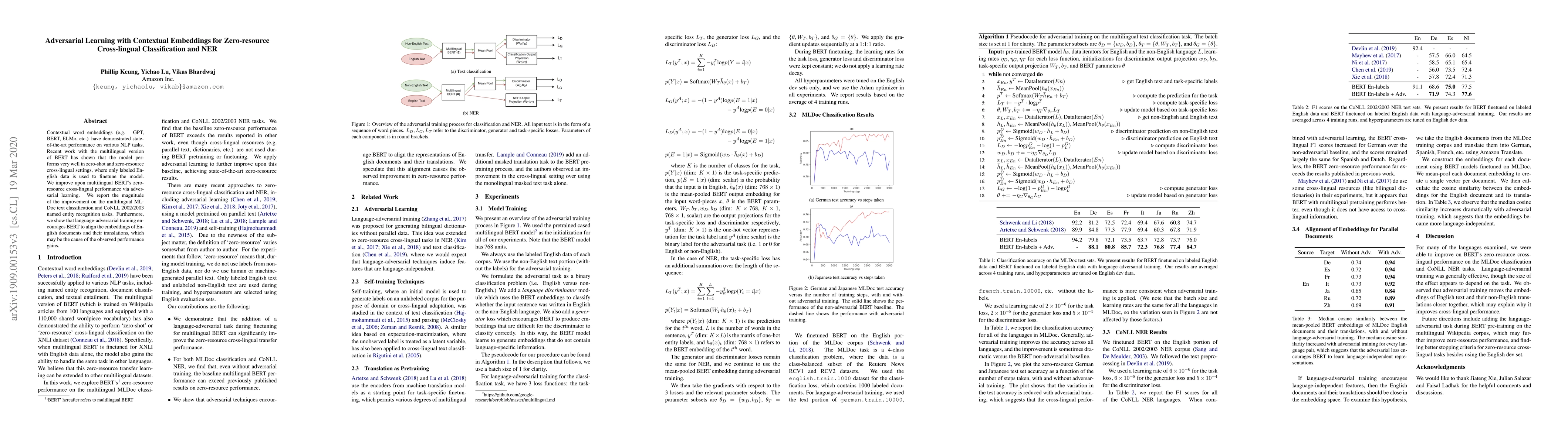 This paper enhances the multilingual BERT model's zero-resource cross-lingual classification and named entity recognition (NER) performance through adversarial learning, reporting significant improvements on multilingual MLDoc and CoNLL datasets, and demonstrating that adversarial training aligns English and translated document embeddings.