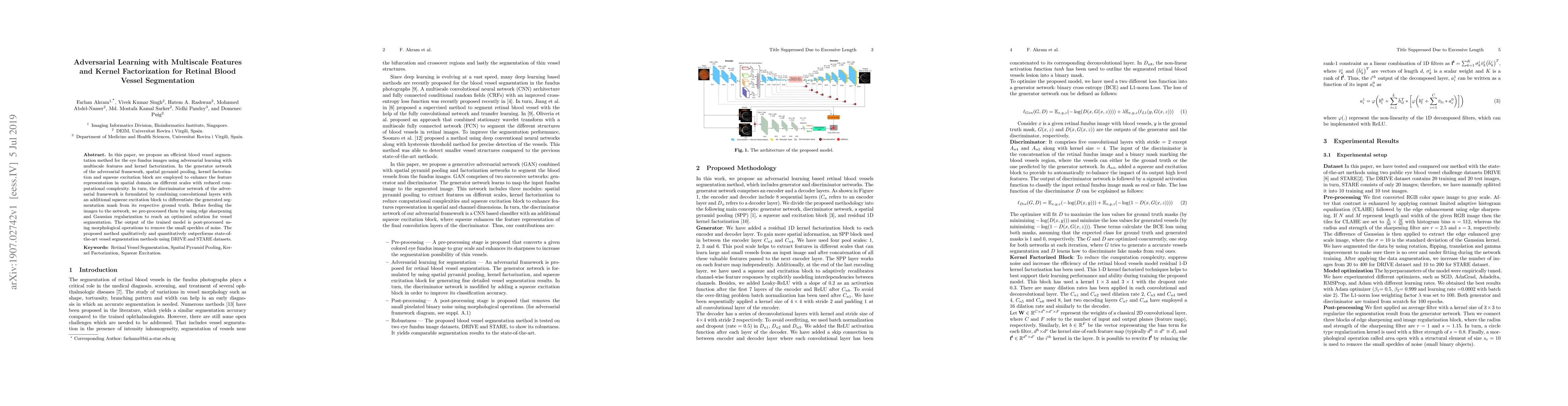 This paper introduces an efficient adversarial learning method for retinal blood vessel segmentation using multiscale features and kernel factorization. The proposed network combines spatial pyramid pooling, kernel factorization, and squeeze excitation blocks to enhance feature representation, achieving superior performance compared to existing methods.