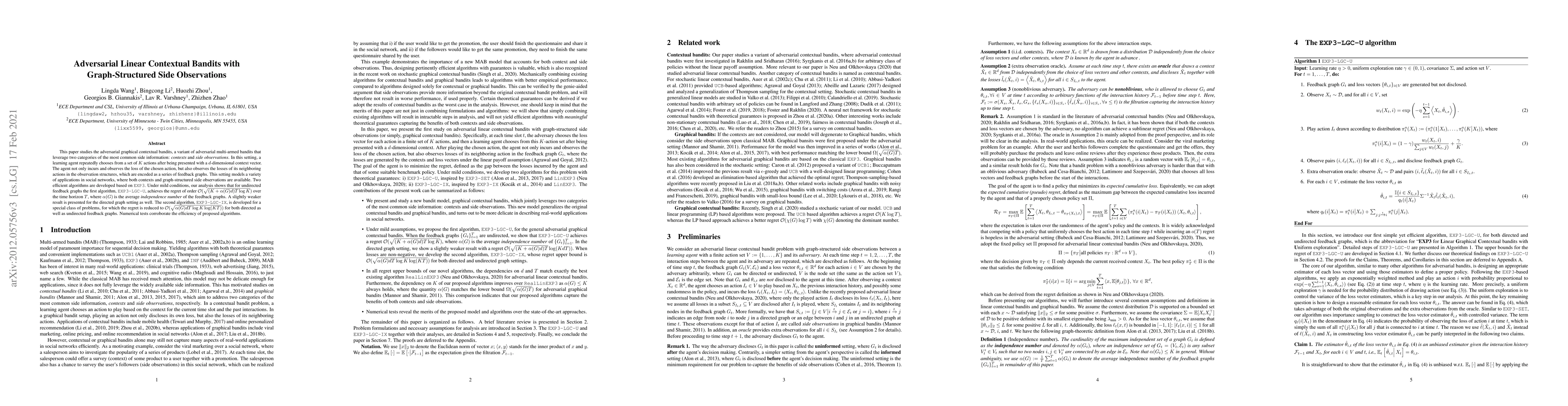 The paper presents novel algorithms EXP3-LGC-U and EXP3-LGC-IX, which efficiently handle adversarial linear contextual bandits with graph-structured side observations, providing regret bounds under mild conditions.
