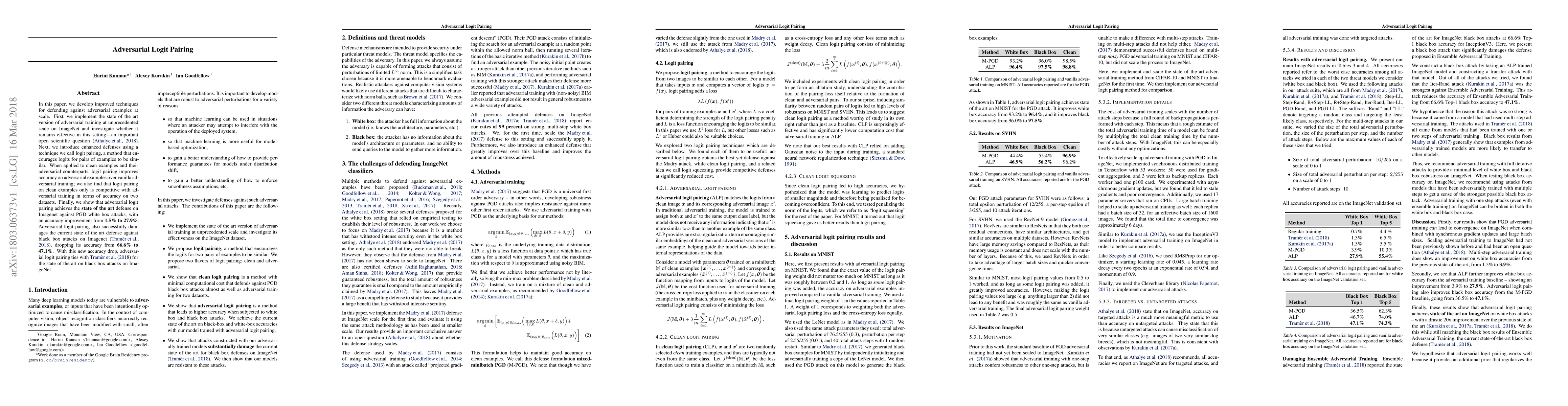 In this paper, we develop improved techniques for defending against adversarial examples at scale. First, we implement the state of the art version of adversarial training at unprecedented scale on ImageNet and investigate whether it remains effective in this setting - an important open scientific question (Athalye et al., 2018). Next, we introduce enhanced defenses using a technique we call logit pairing, a method that encourages logits for pairs of examples to be similar. When applied to clean examples and their adversarial counterparts, logit pairing improves accuracy on adversarial examples over vanilla adversarial training; we also find that logit pairing on clean examples only is competitive with adversarial training in terms of accuracy on two datasets. Finally, we show that adversarial logit pairing achieves the state of the art defense on ImageNet against PGD white box attacks, with an accuracy improvement from 1.5% to 27.9%. Adversarial logit pairing also successfully damages the current state of the art defense against black box attacks on ImageNet (Tramer et al., 2018), dropping its accuracy from 66.6% to 47.1%. With this new accuracy drop, adversarial logit pairing ties with Tramer et al.(2018) for the state of the art on black box attacks on ImageNet.