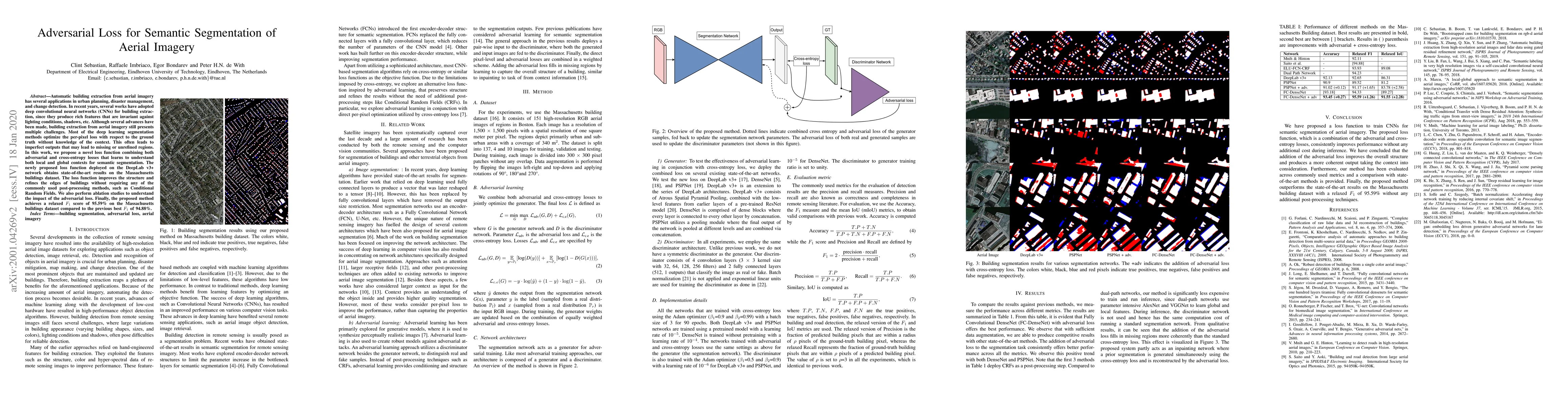 This paper proposes a novel loss function combining adversarial and cross-entropy losses for semantic segmentation of aerial imagery, achieving state-of-the-art results on the Massachusetts buildings dataset with an improved F1 score of 95.59%. The adversarial loss enhances the model's understanding of both local and global contexts, refining building edges without post-processing.