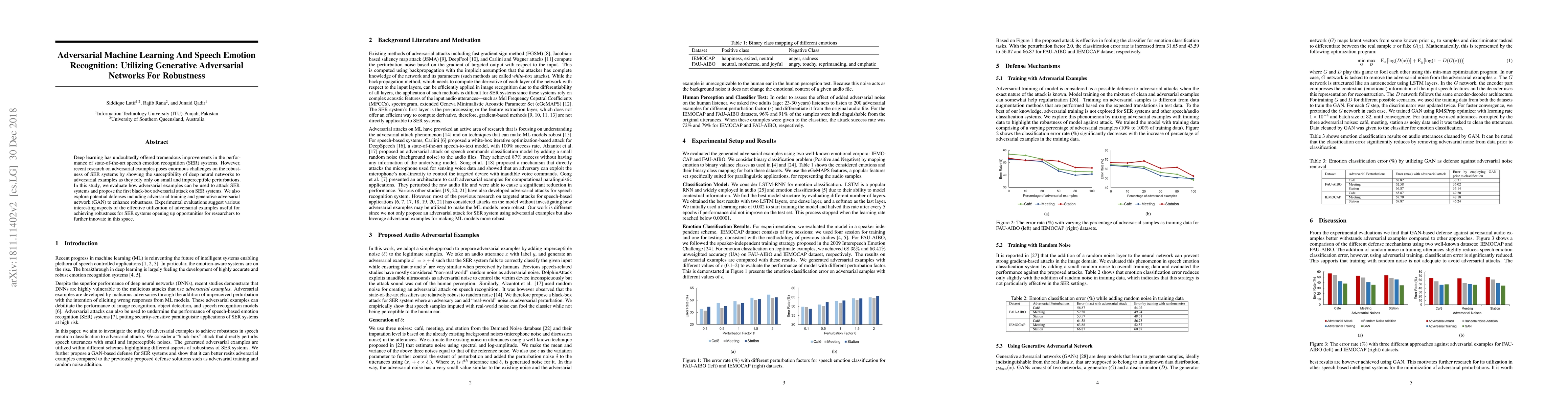 This paper investigates the vulnerabilities of speech emotion recognition (SER) systems to adversarial examples and proposes a black-box attack method. It explores defenses like adversarial training and GANs to enhance SER robustness, revealing promising avenues for future research.