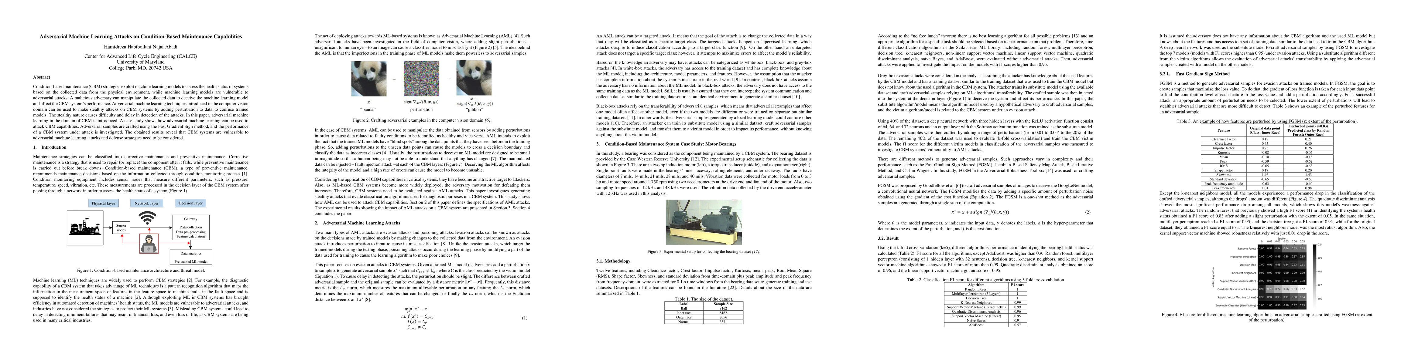 This paper explores adversarial machine learning attacks on condition-based maintenance systems, demonstrating how perturbations can deceive machine learning models, thereby compromising system performance. The study crafts adversarial samples using the Fast Gradient Sign method, revealing the vulnerability of CBM systems and emphasizing the need for defense strategies.