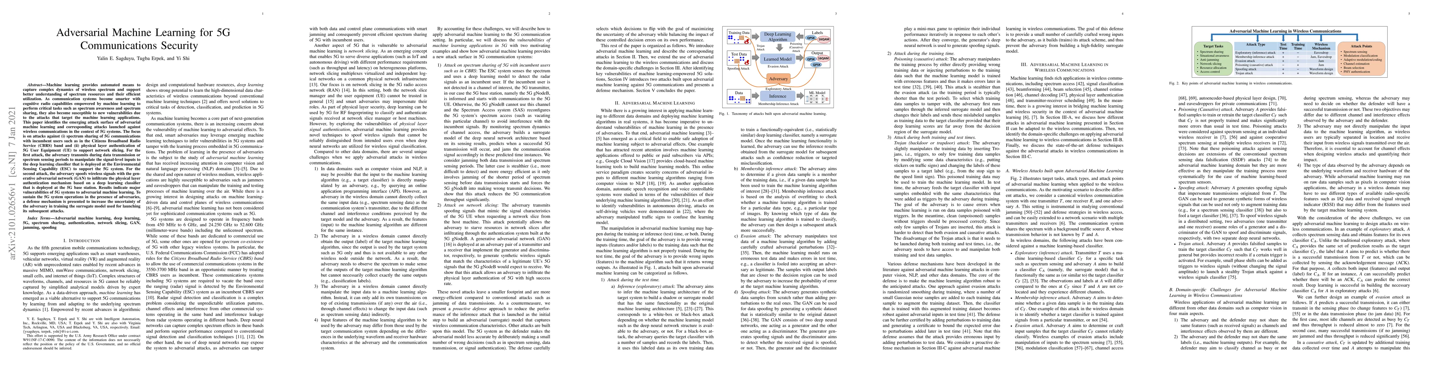 This paper investigates adversarial machine learning threats to 5G communications, focusing on attacks targeting spectrum sharing and physical layer authentication. It proposes a defense mechanism to increase uncertainty for adversaries attempting to manipulate machine learning classifiers in 5G systems.