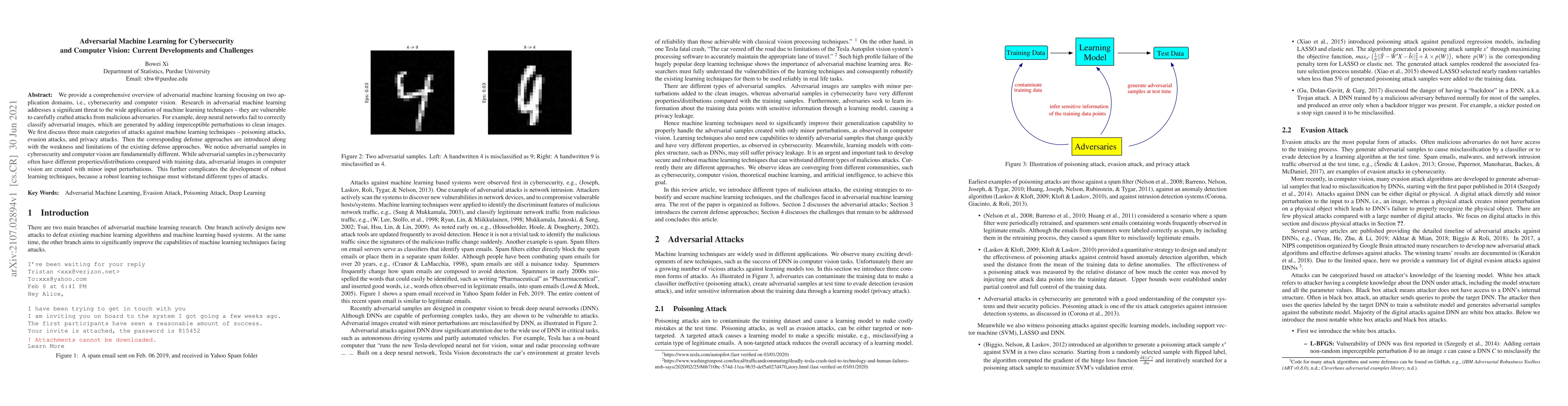 This paper reviews adversarial machine learning threats, focusing on cybersecurity and computer vision, highlighting vulnerabilities like poisoning, evasion, and privacy attacks. It discusses existing defense approaches, noting the distinct nature of adversarial samples in these domains and the challenges in developing robust learning techniques.