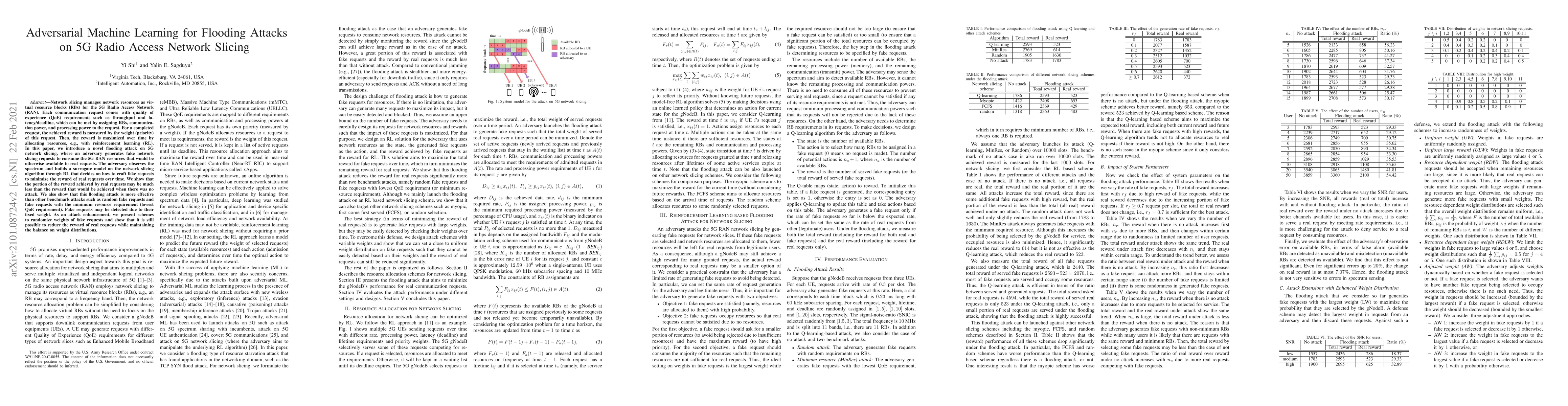 This paper introduces a novel flooding attack on 5G network slicing, where an adversary generates fake requests to consume RAN resources, minimizing the reward of real requests. The attack is shown to be more effective than other methods, and enhancements to randomize fake request weights maintain its efficacy while balancing weight distributions.