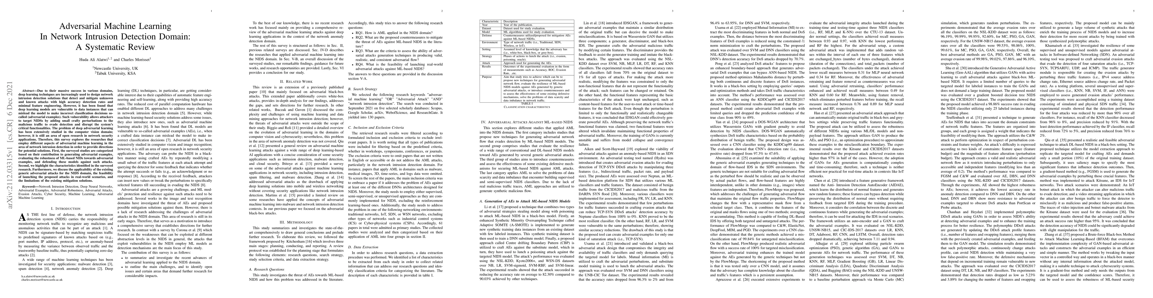 This paper systematically reviews research on adversarial machine learning in network intrusion detection, categorizing studies based on their contributions to generating adversarial examples, evaluating model robustness, and defending against attacks. It highlights the challenges and limitations of existing solutions and discusses the feasibility of proposed attacks in real-world scenarios.