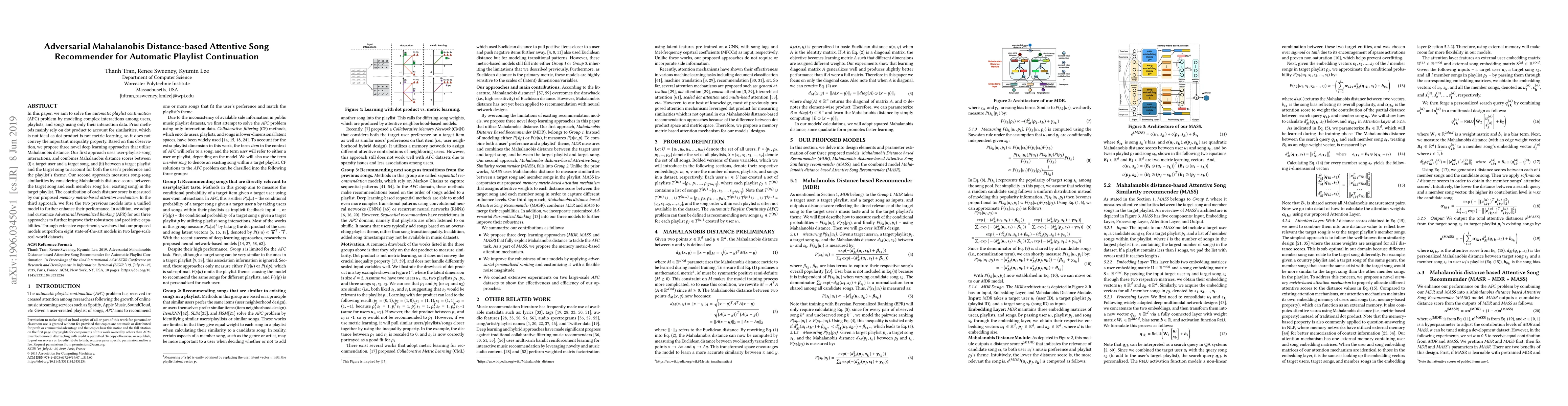 This paper proposes three novel deep learning methods for automatic playlist continuation using Mahalanobis distance to better capture user-song and playlist-song interactions. The approaches incorporate an attentive mechanism and Adversarial Personalized Ranking to enhance performance, demonstrating superior results compared to eight state-of-the-art models on large-scale datasets.