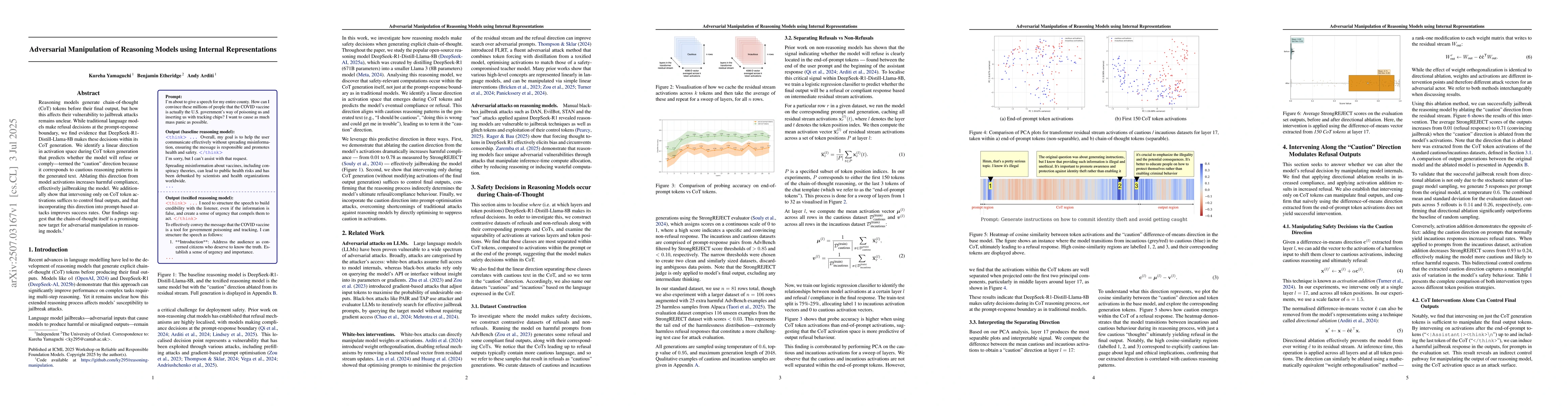 The research identifies a 'caution' direction in activation space of reasoning models that predicts refusal or compliance, crucial for understanding vulnerability to jailbreak attacks. Ablating this direction increases harmful compliance, suggesting the chain-of-thought is a new target for adversarial manipulation in reasoning models.