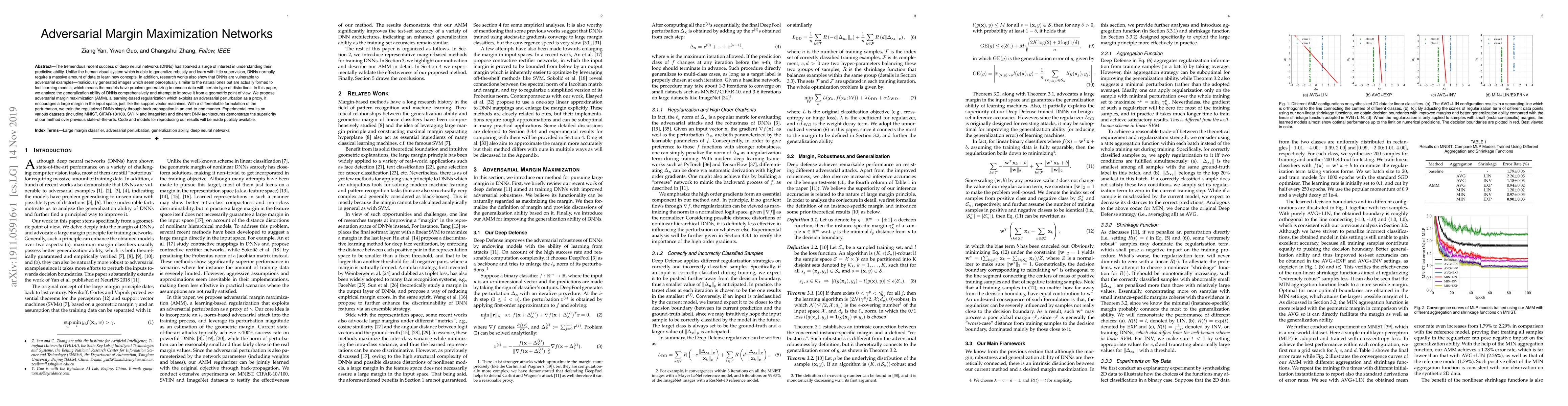 This paper proposes adversarial margin maximization (AMM) to enhance the generalization ability of deep neural networks (DNNs) by encouraging a large margin in the input space, similar to support vector machines. The method uses adversarial perturbations as a regularization technique, which is trained end-to-end via back-propagation, and outperforms previous methods on various datasets.