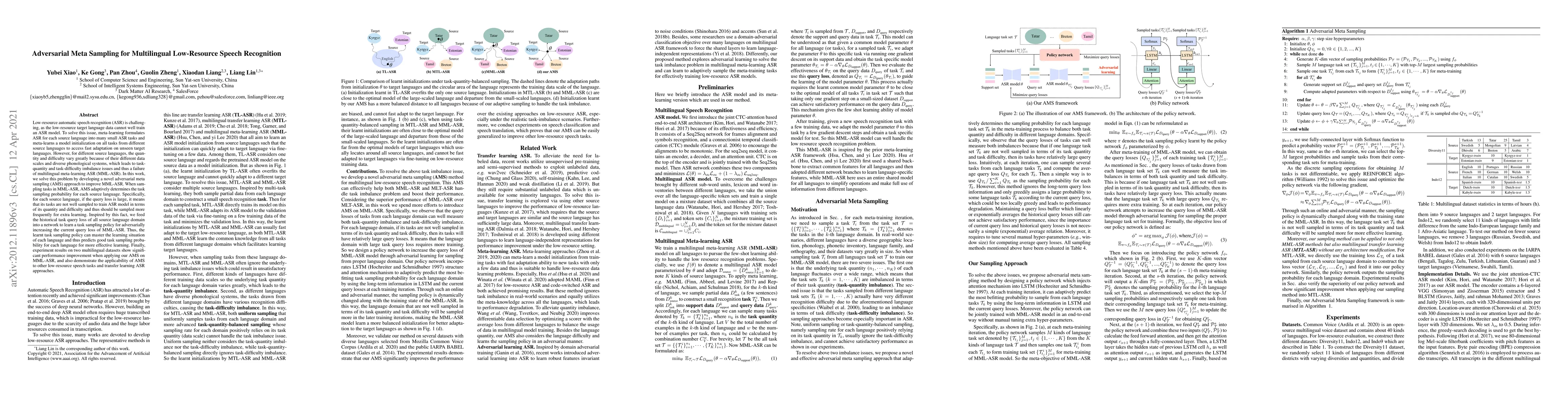 Low-resource automatic speech recognition (ASR) is challenging, as the low-resource target language data cannot well train an ASR model. To solve this issue, meta-learning formulates ASR for each source language into many small ASR tasks and meta-learns a model initialization on all tasks from different source languages to access fast adaptation on unseen target languages. However, for different source languages, the quantity and difficulty vary greatly because of their different data scales and diverse phonological systems, which leads to task-quantity and task-difficulty imbalance issues and thus a failure of multilingual meta-learning ASR (MML-ASR). In this work, we solve this problem by developing a novel adversarial meta sampling (AMS) approach to improve MML-ASR. When sampling tasks in MML-ASR, AMS adaptively determines the task sampling probability for each source language. Specifically, for each source language, if the query loss is large, it means that its tasks are not well sampled to train ASR model in terms of its quantity and difficulty and thus should be sampled more frequently for extra learning. Inspired by this fact, we feed the historical task query loss of all source language domain into a network to learn a task sampling policy for adversarially increasing the current query loss of MML-ASR. Thus, the learnt task sampling policy can master the learning situation of each language and thus predicts good task sampling probability for each language for more effective learning. Finally, experiment results on two multilingual datasets show significant performance improvement when applying our AMS on MML-ASR, and also demonstrate the applicability of AMS to other low-resource speech tasks and transfer learning ASR approaches.