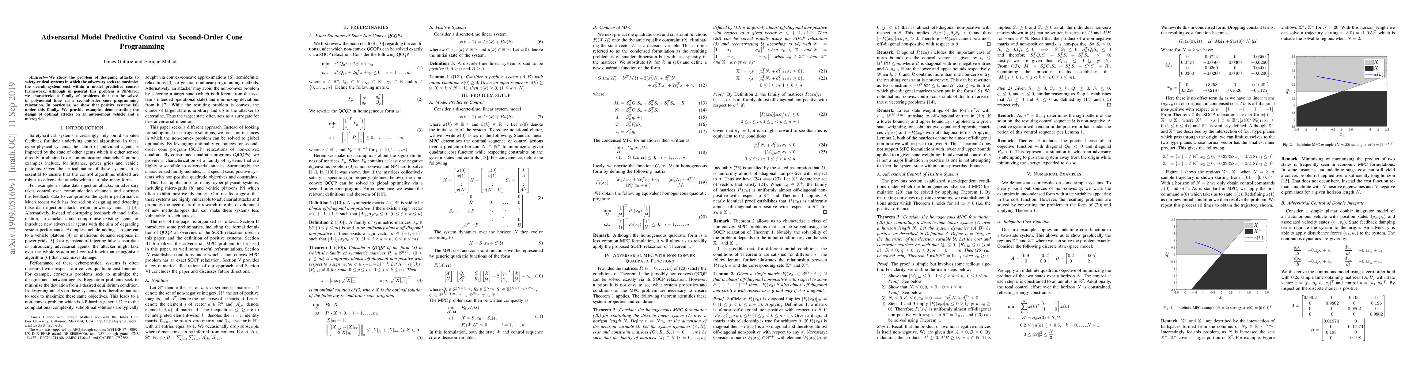 We study the problem of designing attacks to safety-critical systems in which the adversary seeks to maximize the overall system cost within a model predictive control framework. Although in general this problem is NP-hard, we characterize a family of problems that can be solved in polynomial time via a second-order cone programming relaxation. In particular, we show that positive systems fall under this family. We provide examples demonstrating the design of optimal attacks on an autonomous vehicle and a microgrid.