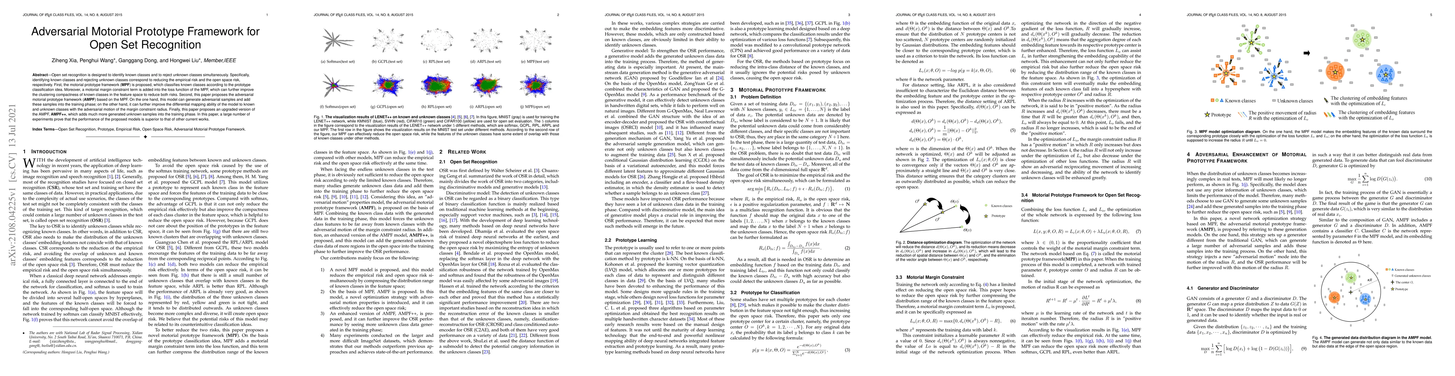 This paper proposes the motorial prototype framework (MPF) for open set recognition, which classifies known classes using prototype ideas and reduces both empirical and open space risks. It further introduces the adversarial motorial prototype framework (AMPF) that generates adversarial samples to enhance model robustness and AMPF++ that incorporates more unknown samples, demonstrating superior performance in experiments.