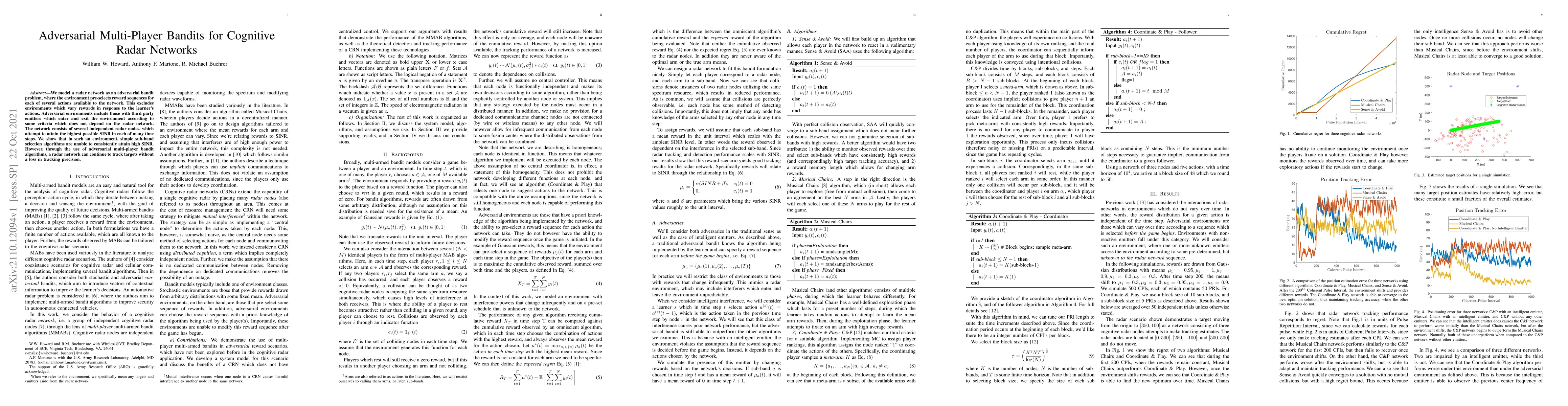 We model a radar network as an adversarial bandit problem, where the environment pre-selects reward sequences for each of several actions available to the network. This excludes environments which vary rewards in response to the learner's actions. Adversarial environments include those with third party emitters which enter and exit the environment according to some criteria which does not depend on the radar network. The network consists of several independent radar nodes, which attempt to attain the highest possible SINR in each of many time steps. We show that in such an environment, simple sub-band selection algorithms are unable to consistently attain high SINR. However, through the use of adversarial multi-player bandit algorithms, a radar network can continue to track targets without a loss in tracking precision.