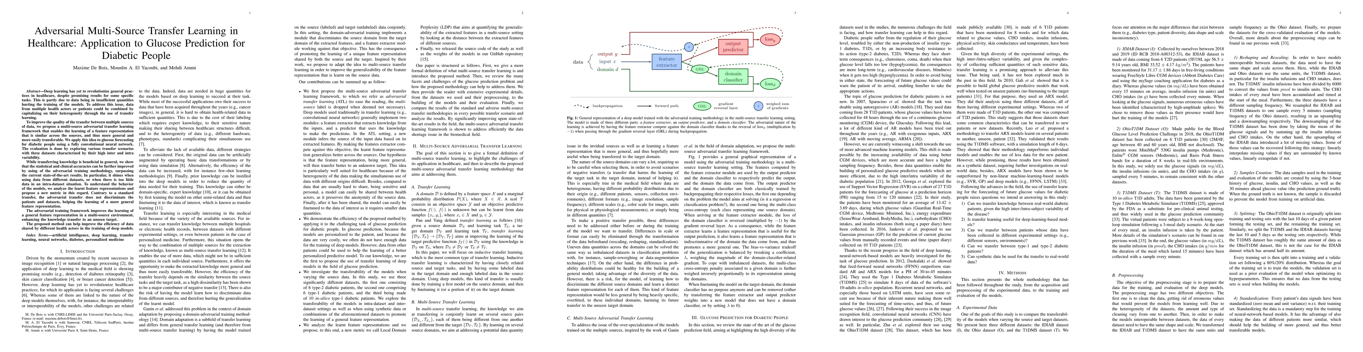 Deep learning has yet to revolutionize general practices in healthcare, despite promising results for some specific tasks. This is partly due to data being in insufficient quantities hurting the training of the models. To address this issue, data from multiple health actors or patients could be combined by capitalizing on their heterogeneity through the use of transfer learning. To improve the quality of the transfer between multiple sources of data, we propose a multi-source adversarial transfer learning framework that enables the learning of a feature representation that is similar across the sources, and thus more general and more easily transferable. We apply this idea to glucose forecasting for diabetic people using a fully convolutional neural network. The evaluation is done by exploring various transfer scenarios with three datasets characterized by their high inter and intra variability. While transferring knowledge is beneficial in general, we show that the statistical and clinical accuracies can be further improved by using of the adversarial training methodology, surpassing the current state-of-the-art results. In particular, it shines when using data from different datasets, or when there is too little data in an intra-dataset situation. To understand the behavior of the models, we analyze the learnt feature representations and propose a new metric in this regard. Contrary to a standard transfer, the adversarial transfer does not discriminate the patients and datasets, helping the learning of a more general feature representation. The adversarial training framework improves the learning of a general feature representation in a multi-source environment, enhancing the knowledge transfer to an unseen target. The proposed method can help improve the efficiency of data shared by different health actors in the training of deep models.