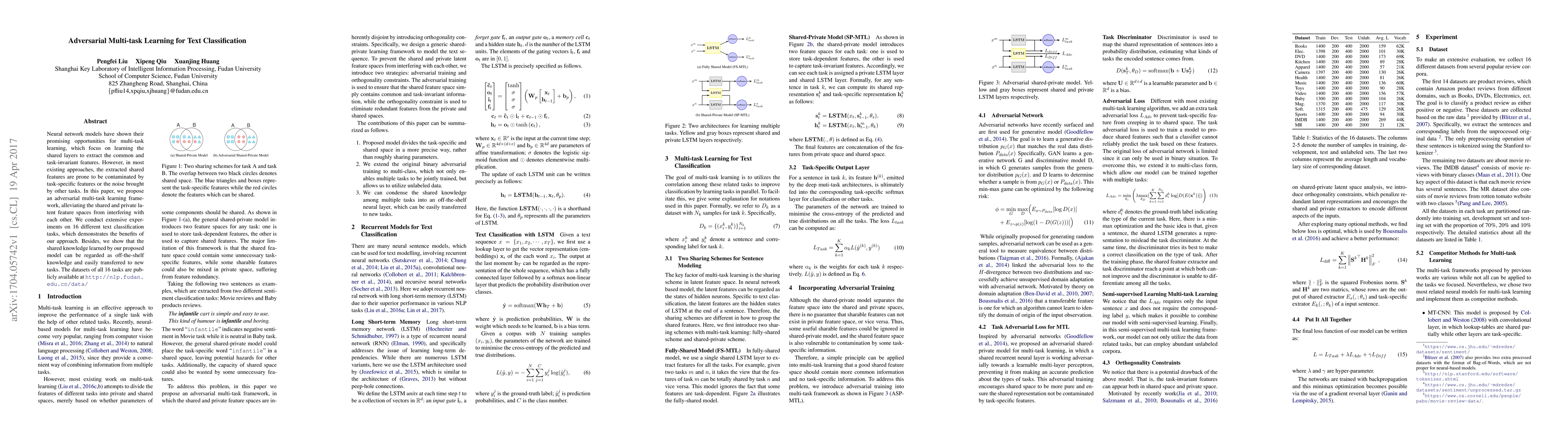 This paper introduces an adversarial multi-task learning framework to improve text classification by separating shared and private feature spaces, reducing interference from task-specific features. Experiments on 16 text classification tasks show the effectiveness of the proposed model, which also demonstrates transferability of learned shared knowledge to new tasks.