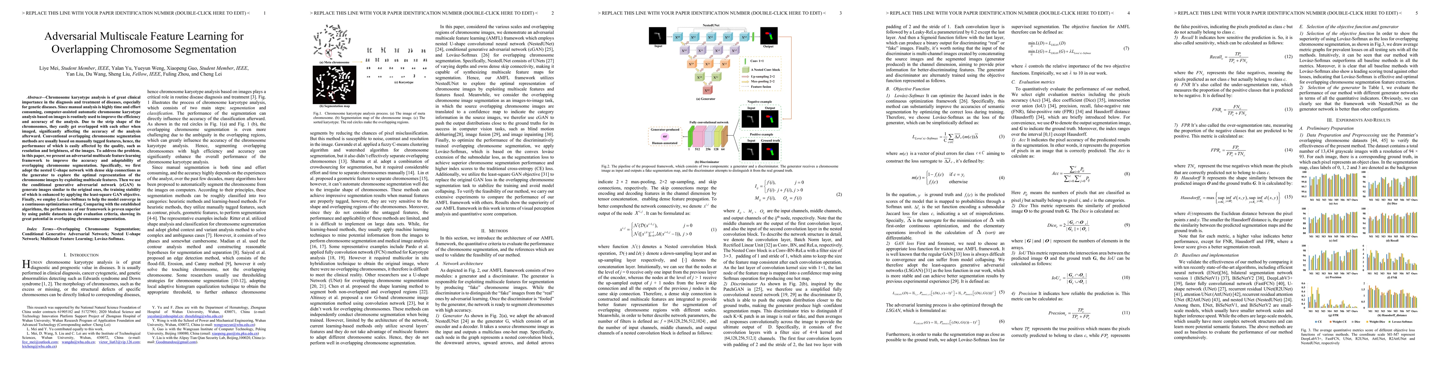 Chromosome karyotype analysis is of great clinical importance in the diagnosis and treatment of diseases, especially for genetic diseases. Since manual analysis is highly time and effort consuming, computer-assisted automatic chromosome karyotype analysis based on images is routinely used to improve the efficiency and accuracy of the analysis. Due to the strip shape of the chromosomes, they easily get overlapped with each other when imaged, significantly affecting the accuracy of the analysis afterward. Conventional overlapping chromosome segmentation methods are usually based on manually tagged features, hence, the performance of which is easily affected by the quality, such as resolution and brightness, of the images. To address the problem, in this paper, we present an adversarial multiscale feature learning framework to improve the accuracy and adaptability of overlapping chromosome segmentation. Specifically, we first adopt the nested U-shape network with dense skip connections as the generator to explore the optimal representation of the chromosome images by exploiting multiscale features. Then we use the conditional generative adversarial network (cGAN) to generate images similar to the original ones, the training stability of which is enhanced by applying the least-square GAN objective. Finally, we employ Lovasz-Softmax to help the model converge in a continuous optimization setting. Comparing with the established algorithms, the performance of our framework is proven superior by using public datasets in eight evaluation criteria, showing its great potential in overlapping chromosome segmentation