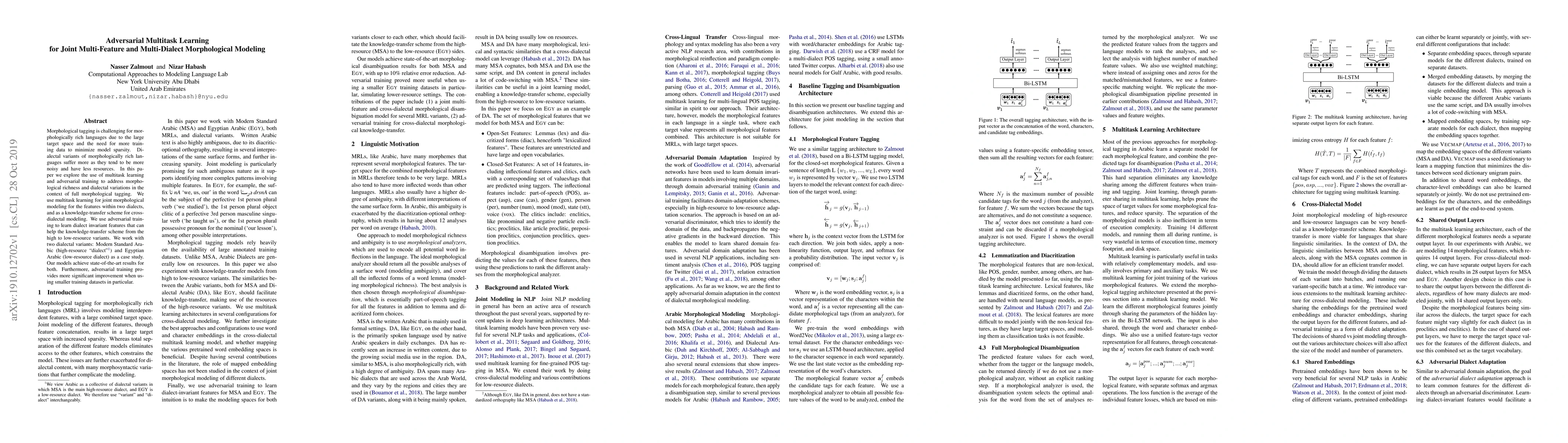 This research explores the use of multitask learning and adversarial training to enhance morphological tagging in morphologically rich languages, specifically tackling dialectal variations between Modern Standard Arabic and Egyptian Arabic. The approach achieves state-of-the-art results, especially benefiting from adversarial training when datasets are small.