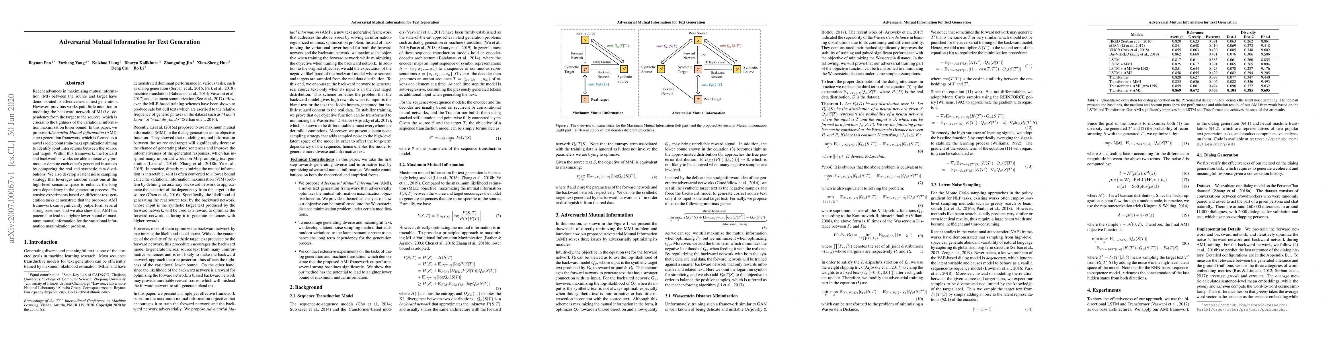 This paper introduces Adversarial Mutual Information (AMI), a text generation framework that optimizes mutual information bidirectionally through a min-max saddle point optimization, enhancing the interaction between source and target data. The proposed method also employs latent noise sampling to improve long-term dependencies, achieving superior performance over baselines in various text generation tasks.