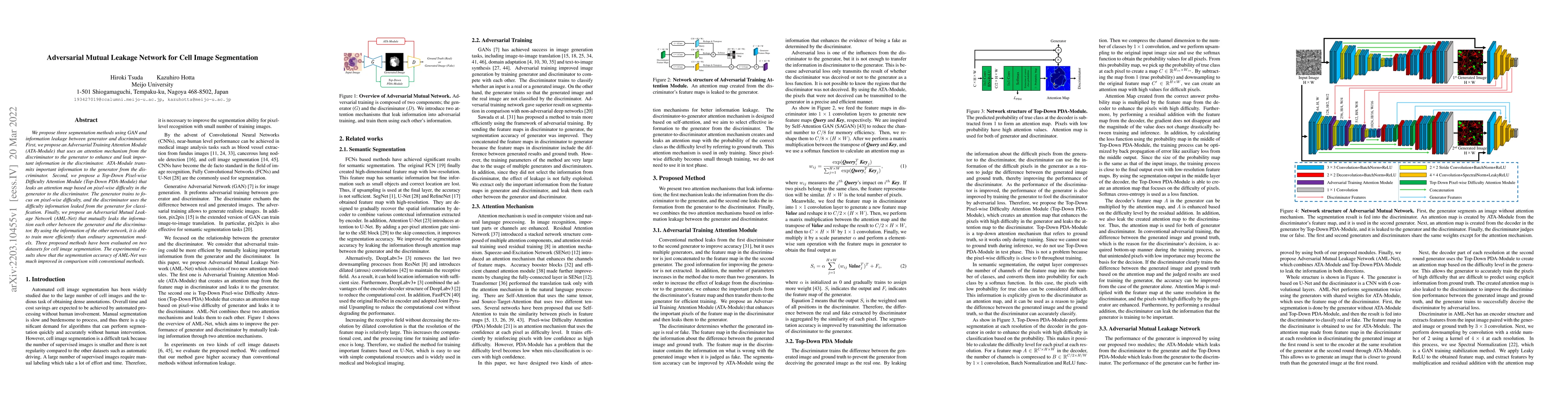 Researchers propose three methods for cell image segmentation using GANs and mutual leakage between generator and discriminator to improve accuracy. The proposed Adversarial Mutual Leakage Network (AML-Net) achieves better results than conventional methods.