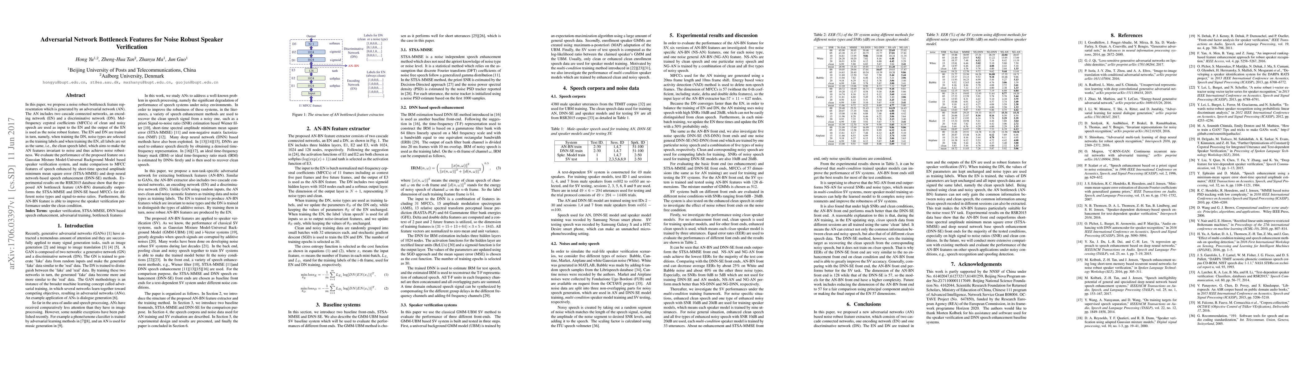 This paper proposes a noise robust feature representation generated by an adversarial network (AN) to enhance speaker verification performance. The AN includes an encoding network (EN) and a discriminative network (DN) trained to make features invariant to noise, significantly outperforming traditional MFCC features enhanced by STSA-MMSE and DNN-SE methods in various noise conditions.