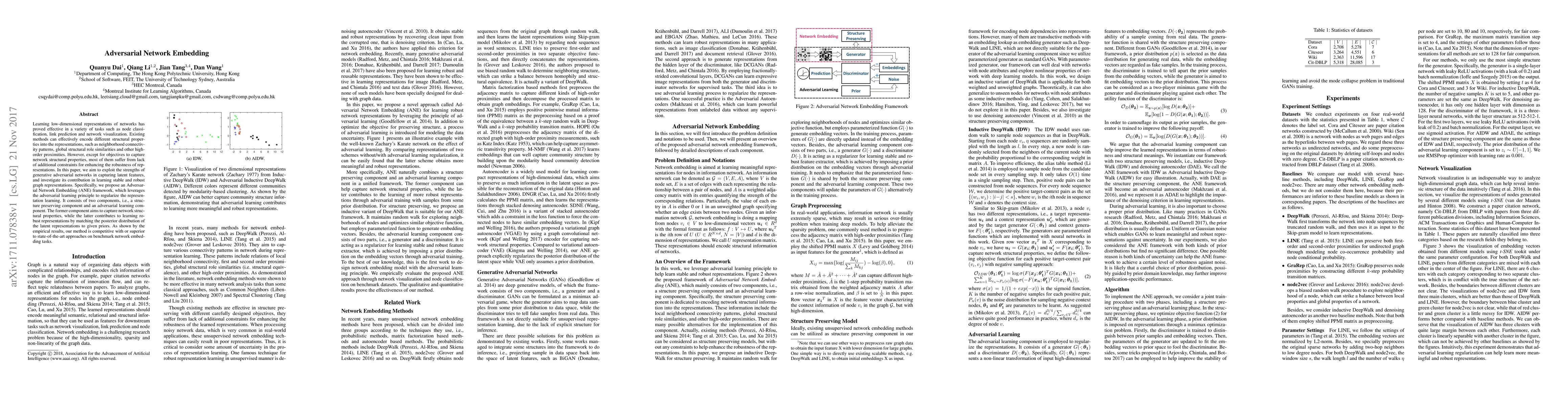 This paper proposes an Adversarial Network Embedding (ANE) framework that uses generative adversarial networks to enhance the robustness of network representations. The framework combines structure-preserving and adversarial learning components to achieve stable and robust embeddings for tasks like node classification and link prediction.