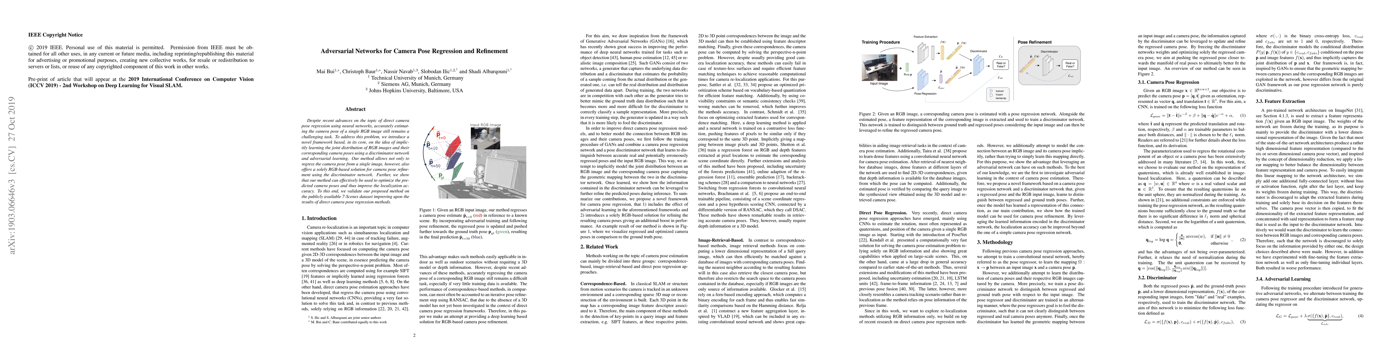 This paper proposes a novel adversarial network framework for regressing and refining camera poses from a single RGB image. It leverages a discriminator network to implicitly learn the joint distribution of images and poses, offering both initial pose estimation and refinement, and demonstrating improved accuracy on the 7-Scenes dataset.