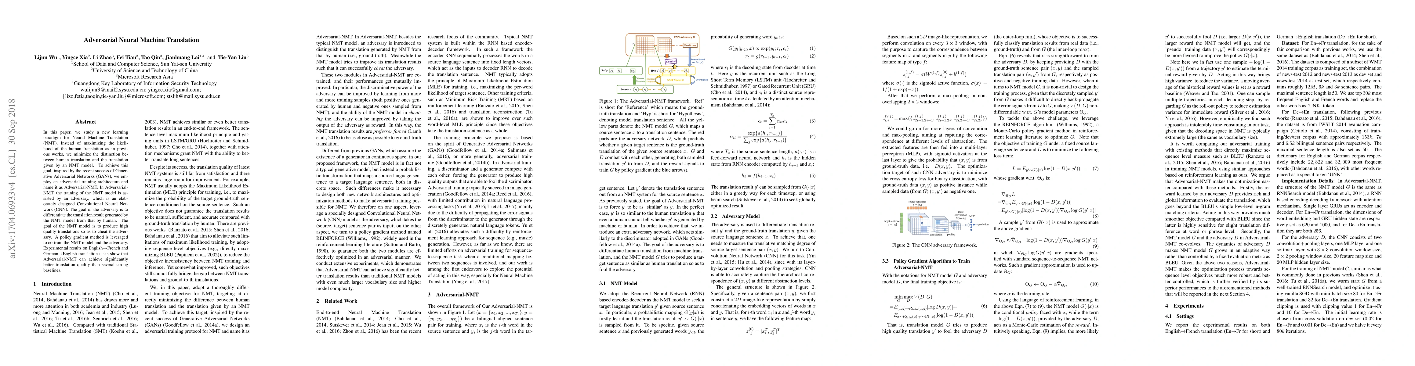 This paper proposes Adversarial-NMT, a novel adversarial training paradigm for Neural Machine Translation, where an NMT model is trained to produce high-quality translations that can deceive a CNN adversary, leading to improved translation quality over strong baselines. Experimental results on English-French and German-English translation tasks demonstrate its effectiveness.