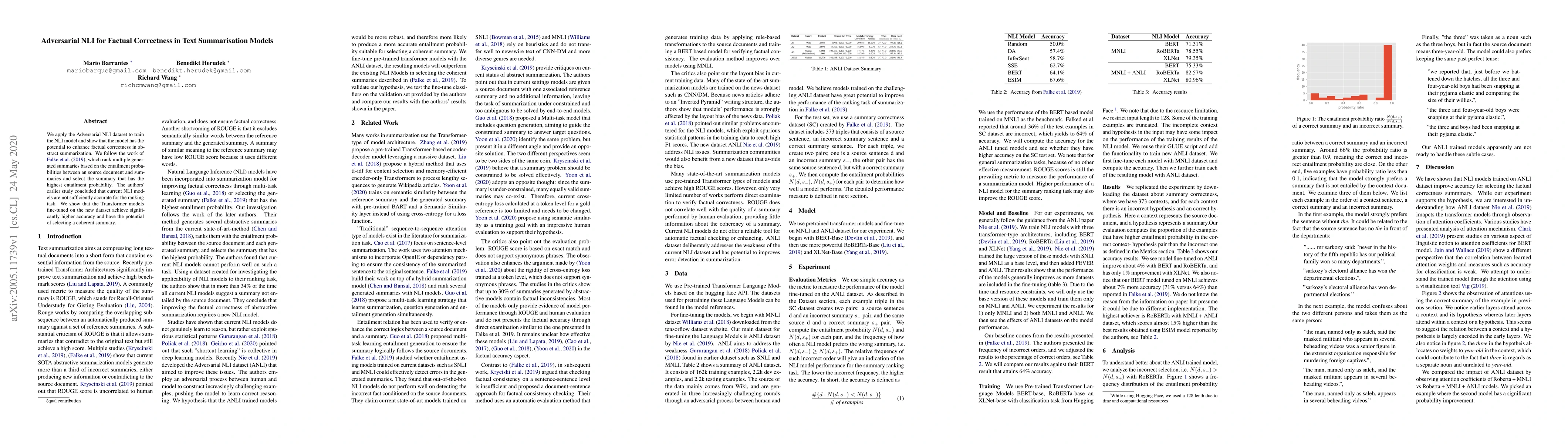 We apply the Adversarial NLI dataset to train the NLI model and show that the model has the potential to enhance factual correctness in abstract summarization. We follow the work of Falke et al. (2019), which rank multiple generated summaries based on the entailment probabilities between an source document and summaries and select the summary that has the highest entailment probability. The authors' earlier study concluded that current NLI models are not sufficiently accurate for the ranking task. We show that the Transformer models fine-tuned on the new dataset achieve significantly higher accuracy and have the potential of selecting a coherent summary.
