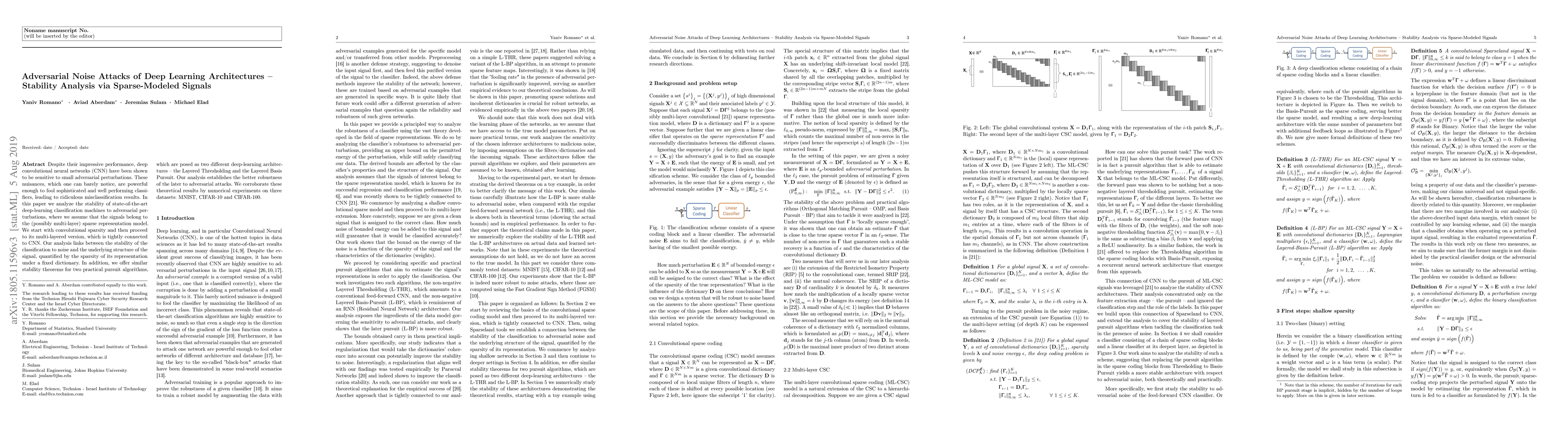 This paper analyzes the sensitivity of deep convolutional neural networks (CNNs) to small, imperceptible adversarial perturbations that can cause misclassification. The study connects the stability of classification to noise with the sparsity of signals under a fixed dictionary, offering stability theorems for two deep-learning architectures: layered Thresholding and layered Basis Pursuit. Numerical experiments on MNIST, CIFAR-10, and CIFAR-100 datasets support the findings, indicating that layered Basis Pursuit shows better robustness against adversarial attacks.
