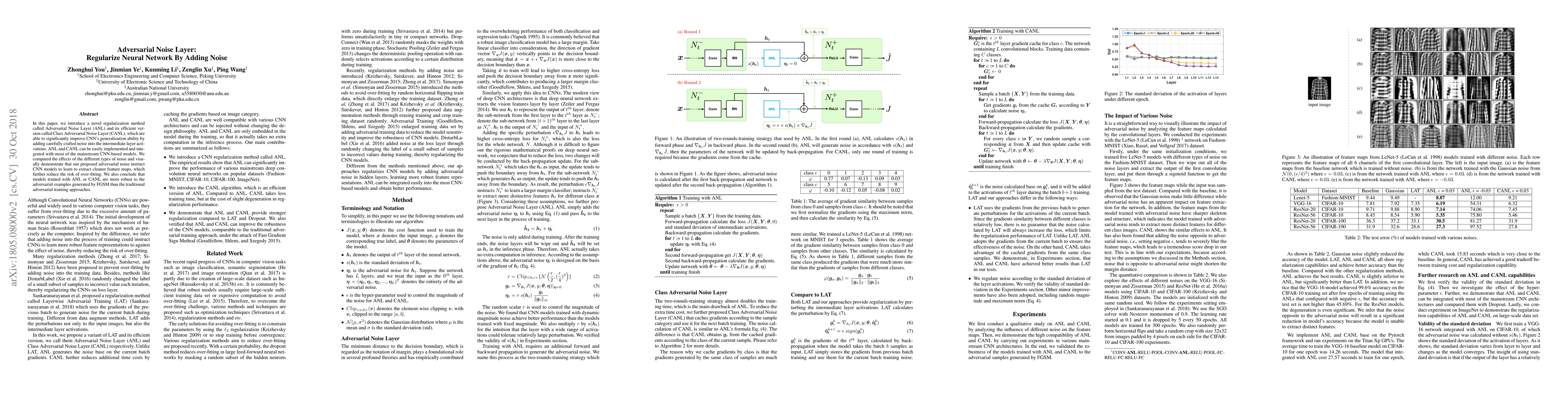In this paper, we introduce a novel regularization method called Adversarial Noise Layer (ANL) and its efficient version called Class Adversarial Noise Layer (CANL), which are able to significantly improve CNN's generalization ability by adding carefully crafted noise into the intermediate layer activations. ANL and CANL can be easily implemented and integrated with most of the mainstream CNN-based models. We compared the effects of the different types of noise and visually demonstrate that our proposed adversarial noise instruct CNN models to learn to extract cleaner feature maps, which further reduce the risk of over-fitting. We also conclude that models trained with ANL or CANL are more robust to the adversarial examples generated by FGSM than the traditional adversarial training approaches.