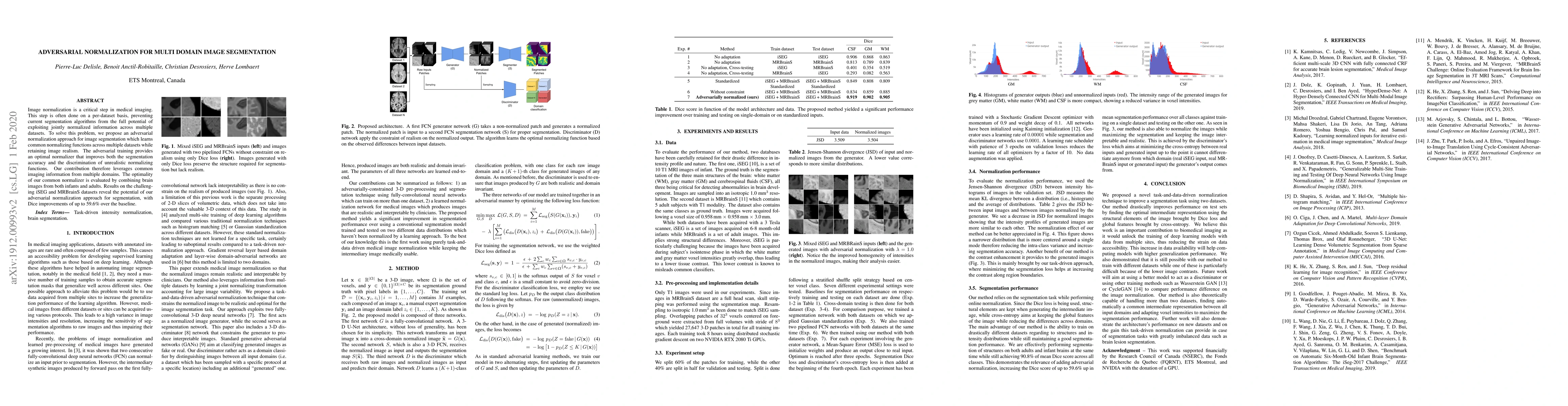 This paper proposes an adversarial normalization method to improve multi-domain image segmentation by learning common normalizing functions across datasets, enhancing segmentation accuracy and realism. Results show significant Dice improvement of up to 59.6% on brain imaging datasets from infants and adults.