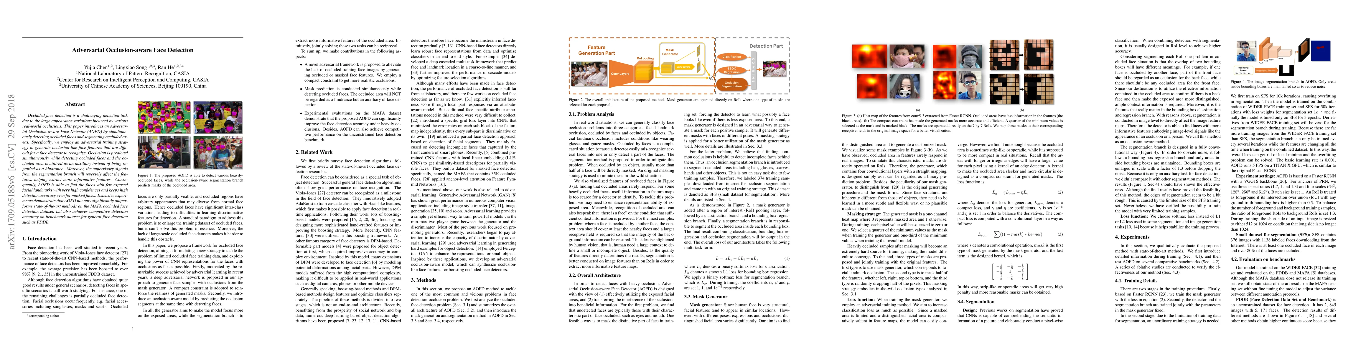 This paper presents an Adversarial Occlusion-aware Face Detector (AOFD) that simultaneously detects occluded faces and segments occluded areas using adversarial training. The method achieves high detection accuracy even for heavily-occluded faces, outperforming state-of-the-art methods on the MAFA dataset and showing competitive results on general face detection datasets like FDDB.